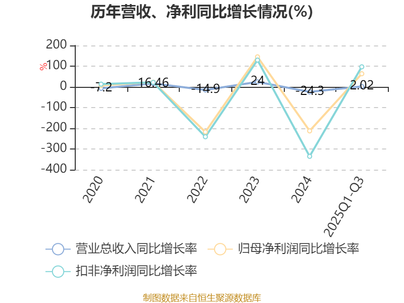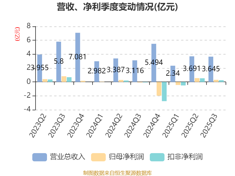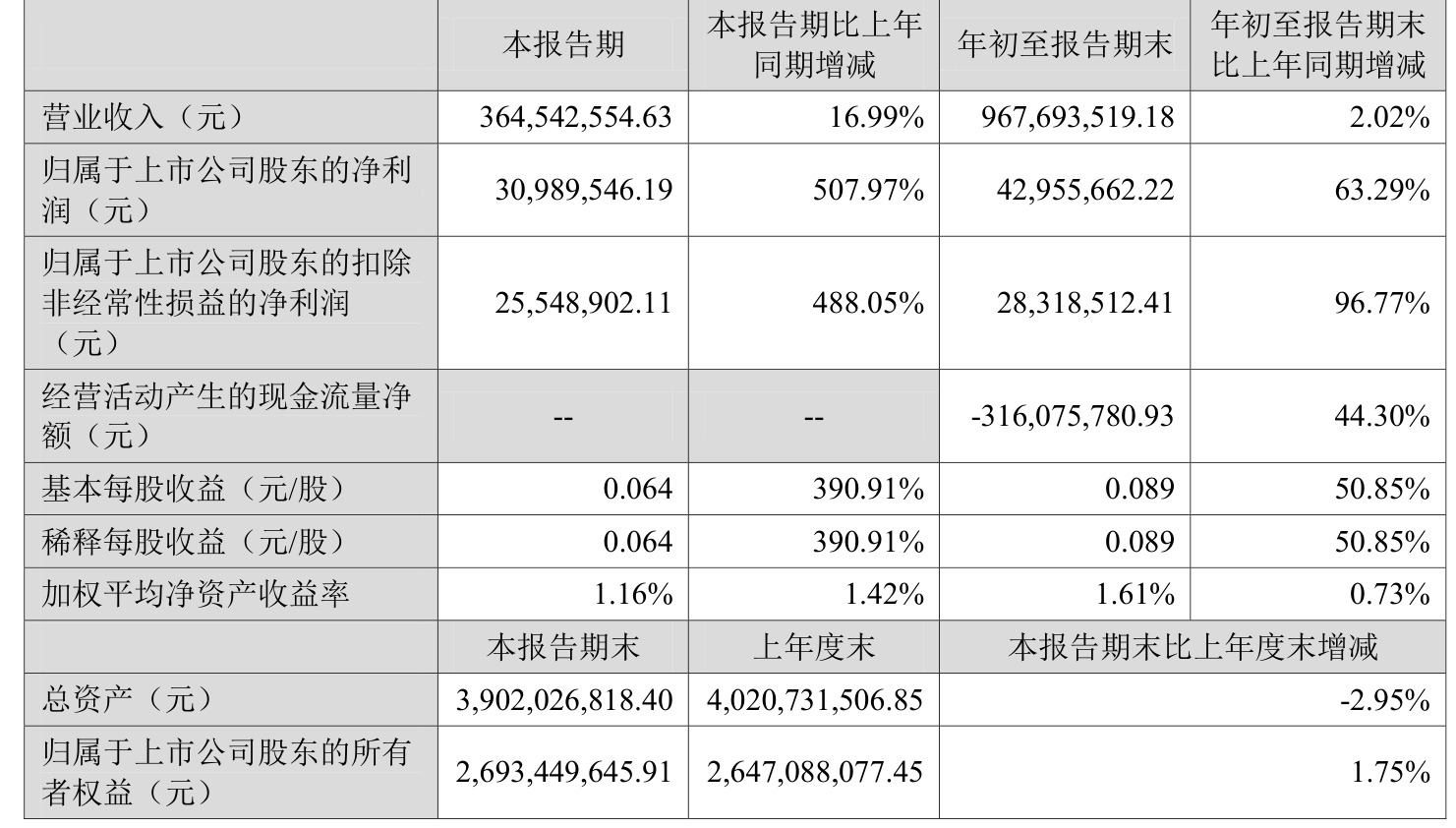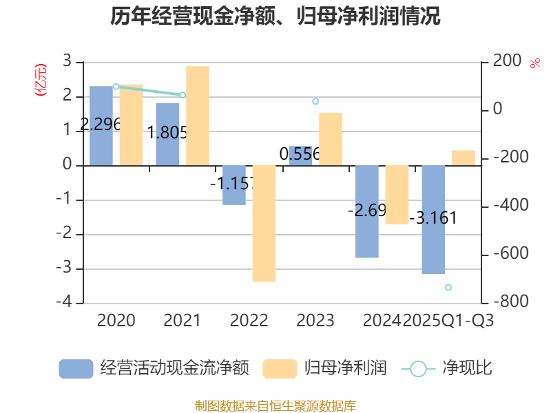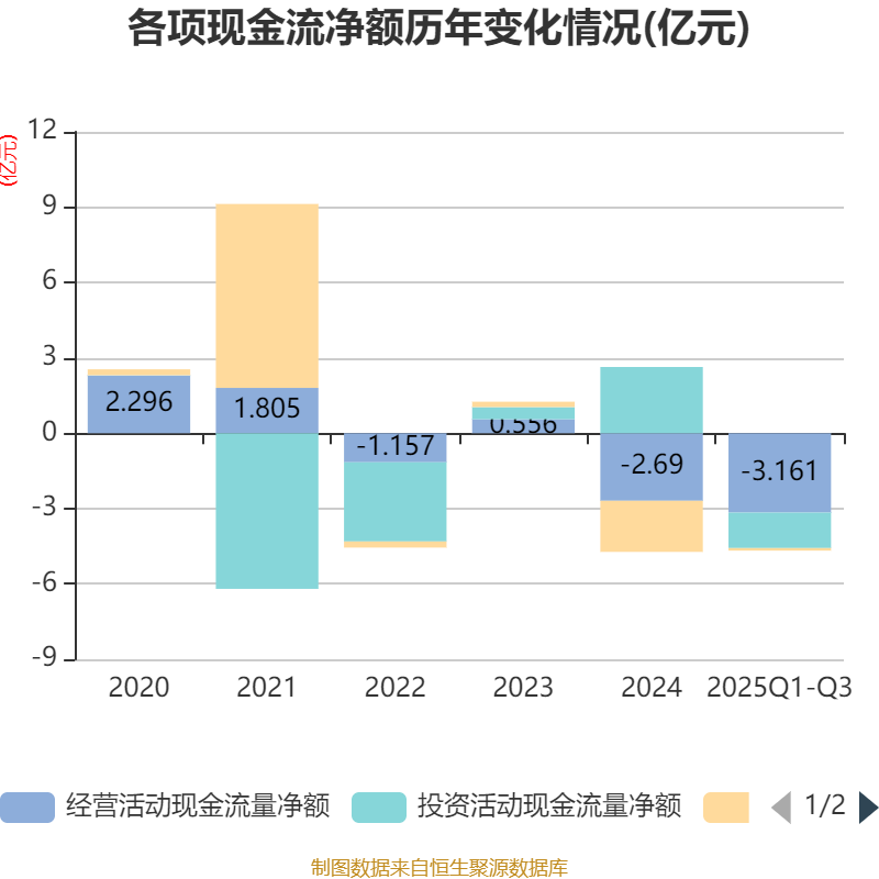 2025年前三季度,公司经营活动现金流净额为-3.16亿元,同比增加2.51亿元;筹资活动现金流净额-1017.08万元,同比增加1.91亿元;投资活动现金流净额-1.41亿元,上年同期为3950.1万元。
