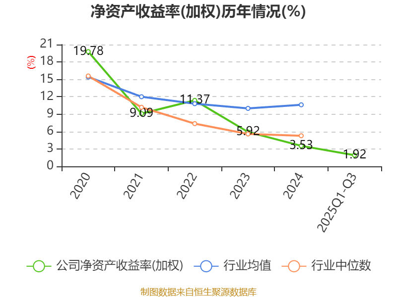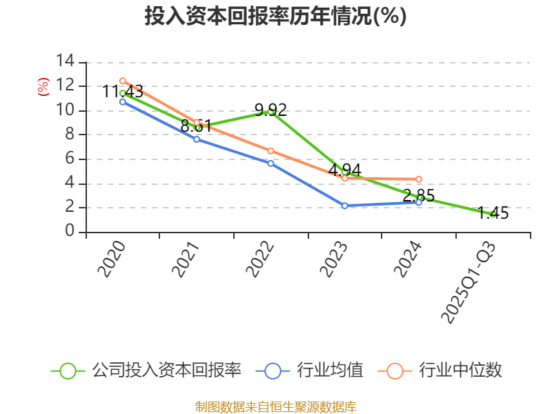 盈利能力方面, 2025年前三季度公司加权平均净资产收益率为1.92%,同比下降2.23个百分点。公司2025年前三季度投入资本回报率为1.45%,较上年同期下降1.71个百分点。