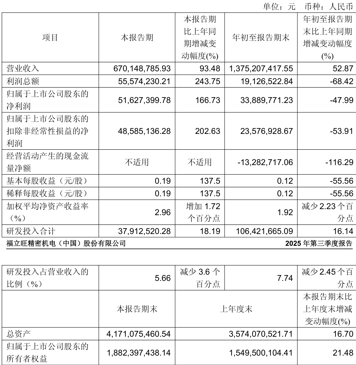 中证智能财讯福立旺(688678)10月28日披露2025年第三季度报告。前三季度公司实现营业总收入13.75亿元,同比增长52.87%;归母净利润3388.98万元,同比下降47.99%;扣非净利润2357.69万元,同比下降53.91%;经营活动产生的现金流量净额为-1328.27万元,上年同期为8153.98万元;报告期内,福立旺基本每股收益为0.12元,加权平均净资产收益率为1.92%。