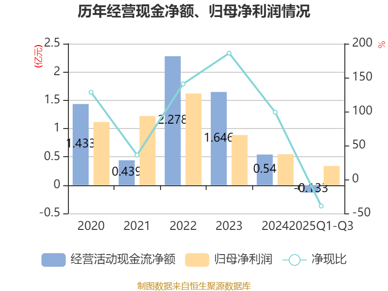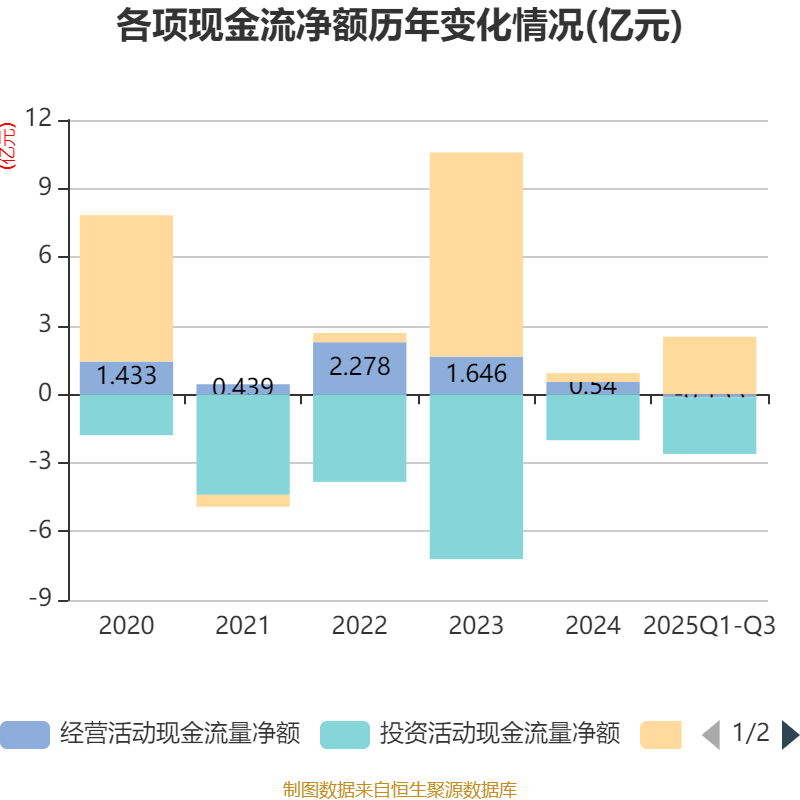 2025年前三季度,公司经营活动现金流净额为-1328.27万元,同比减少9482.25万元;筹资活动现金流净额2.52亿元,同比增加2.26亿元;投资活动现金流净额-2.48亿元,上年同期为-2.46亿元。