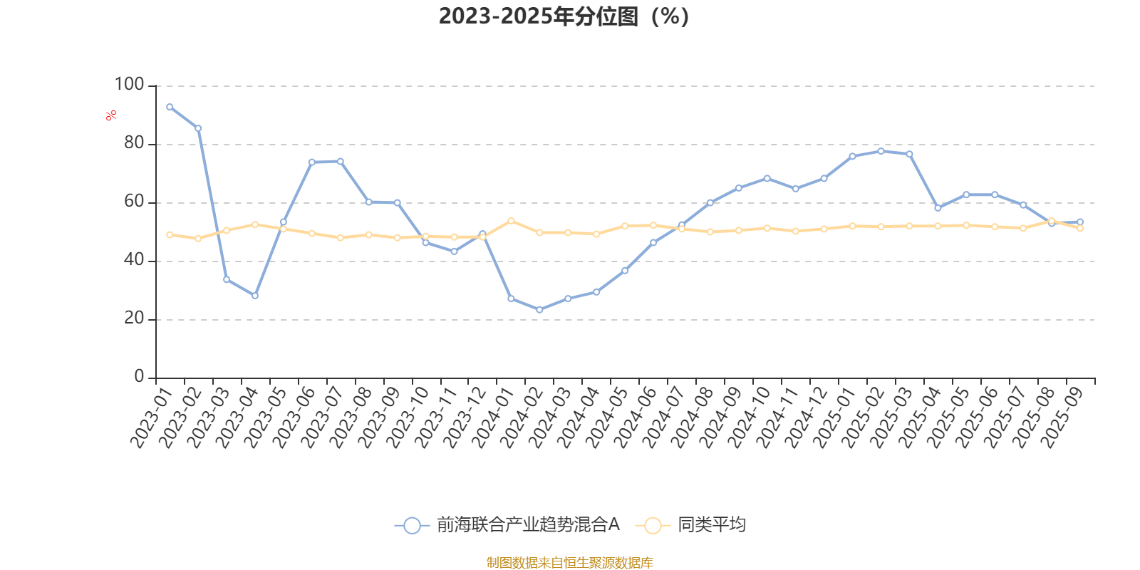 通过所选区间该基金净值增长率分位图,可以观察该基金与同类基金业绩比较情况。图为坐标原点到区间内某时点的净值增长率在同类基金中的分位数。