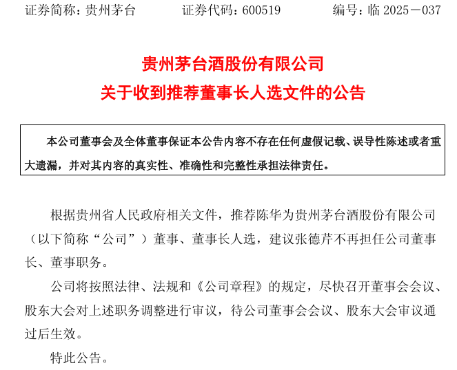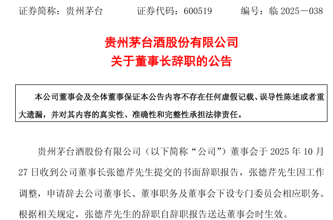贵州茅台(600519)10月27日晚间公告,公司董事会于2025年10月27日收到公司董事长张德芹提交的书面辞职报告,张德芹因工作调整,申请辞去公司董事长、董事职务及董事会下设专门委员会相应职务。根据相关规定,张德芹的辞职自辞职报告送达董事会时生效。