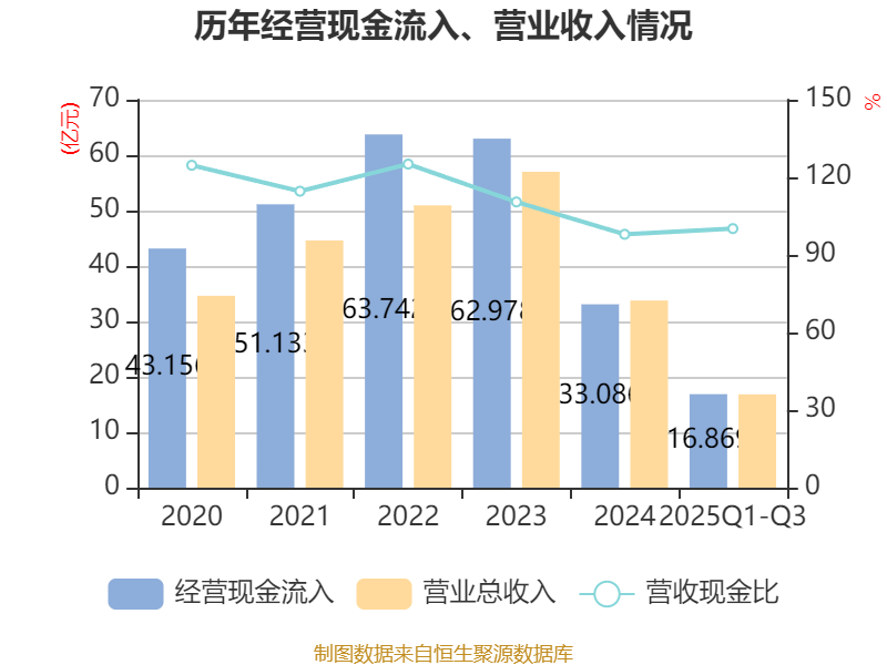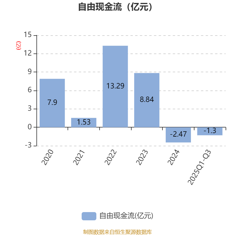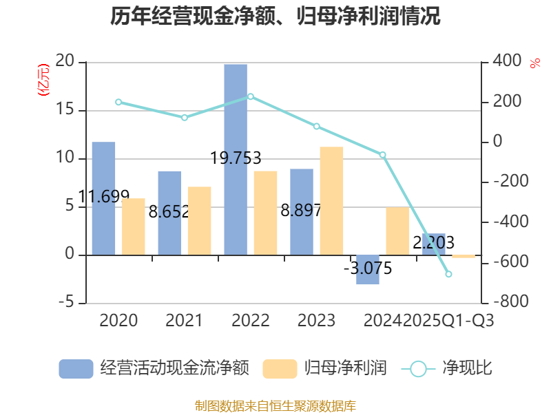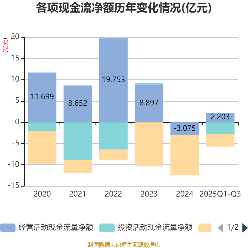 2025年前三季度,公司经营活动现金流净额为2.2亿元,同比增加6.19亿元;筹资活动现金流净额-2.96亿元,同比增加6.47亿元;投资活动现金流净额-2.77亿元,上年同期为2.55亿元。