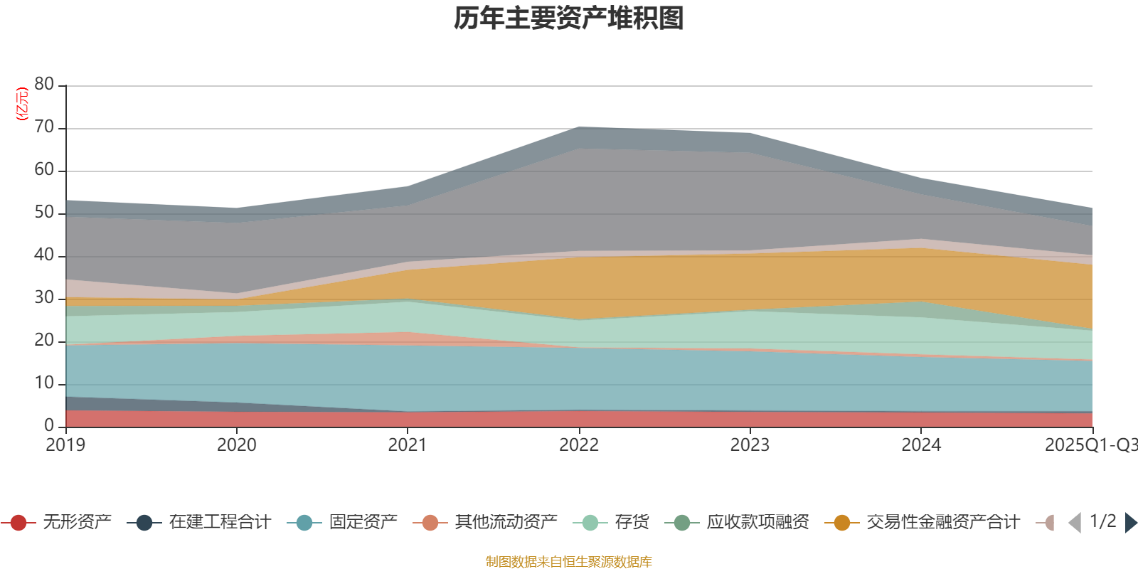 资产重大变化方面,截至2025年三季度末,公司交易性金融资产合计较上年末增加19.21%,占公司总资产比重上升7.68个百分点;应收款项融资较上年末减少88.21%,占公司总资产比重下降5.5个百分点;货币资金较上年末减少34.1%,占公司总资产比重下降4.48个百分点;存货较上年末减少22.14%,占公司总资产比重下降1.71个百分点。