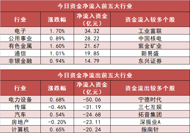 申万一级行业中,14个行业实现资金净流入,其中电子行业净流入34.32亿元居首。