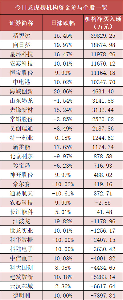 盘后龙虎榜数据显示,机构现身多股,其中精智达等股票呈现机构资金净买入,德明利等股票呈现机构资金净卖出。