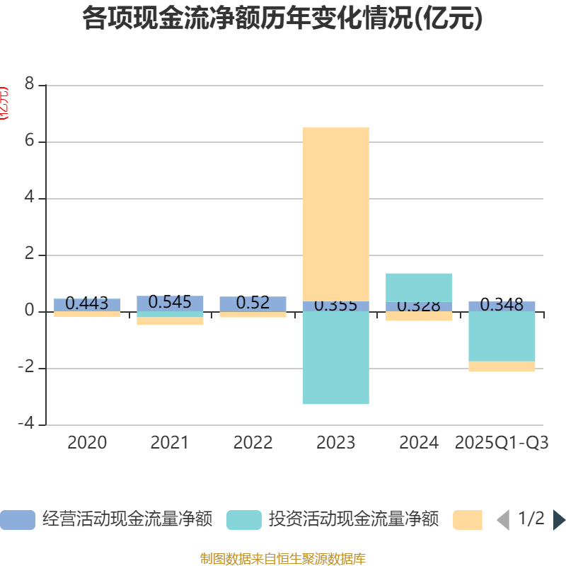 2025年前三季度,公司经营活动现金流净额为3480.12万元,同比增加1.14亿元;筹资活动现金流净额-3550.27万元,同比减少244.11万元;投资活动现金流净额-1.77亿元,上年同期为-2.63亿元。