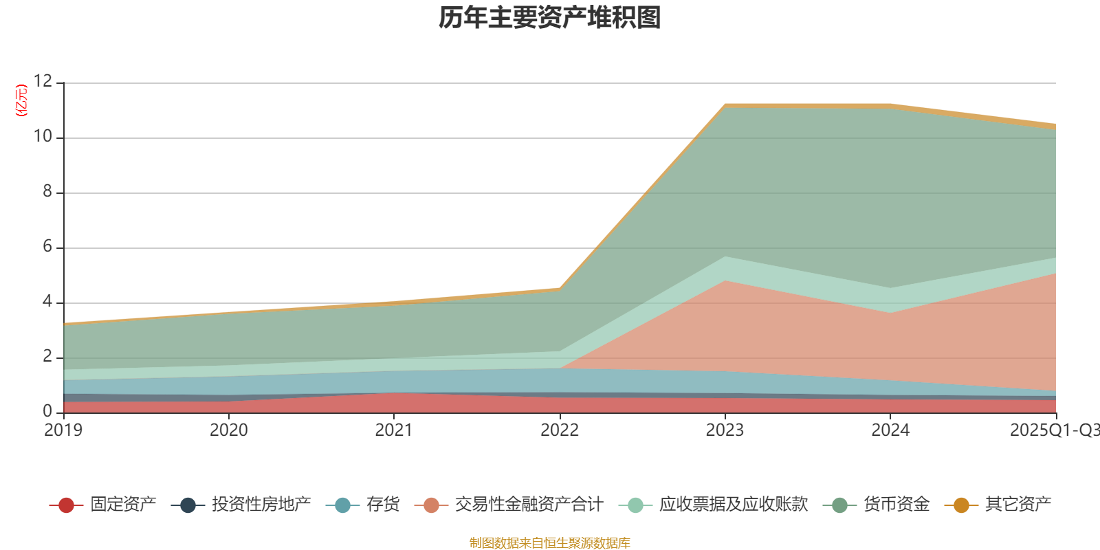 资产重大变化方面,截至2025年三季度末,公司交易性金融资产合计较上年末增加74.34%,占公司总资产比重上升18.9个百分点;货币资金较上年末减少28.69%,占公司总资产比重下降13.74个百分点;存货较上年末减少64.69%,占公司总资产比重下降2.96个百分点;应收票据及应收账款较上年末减少37.21%,占公司总资产比重下降2.65个百分点。