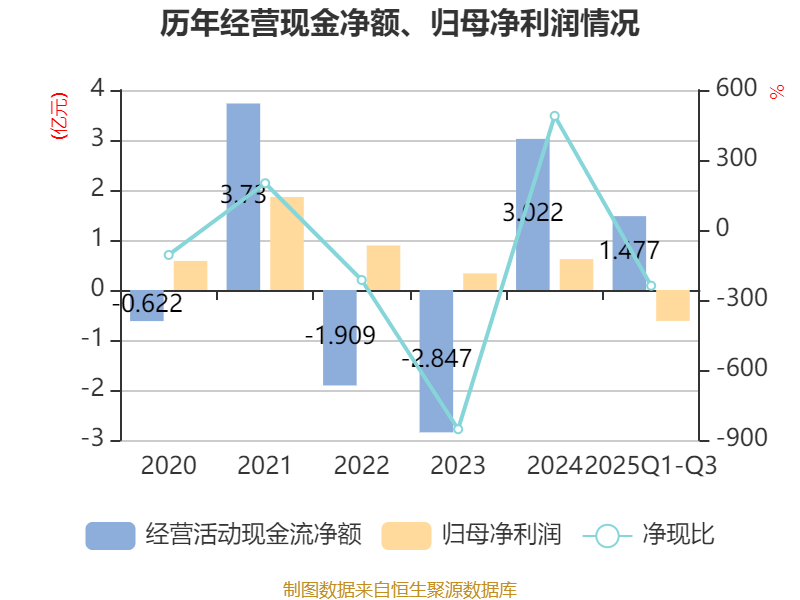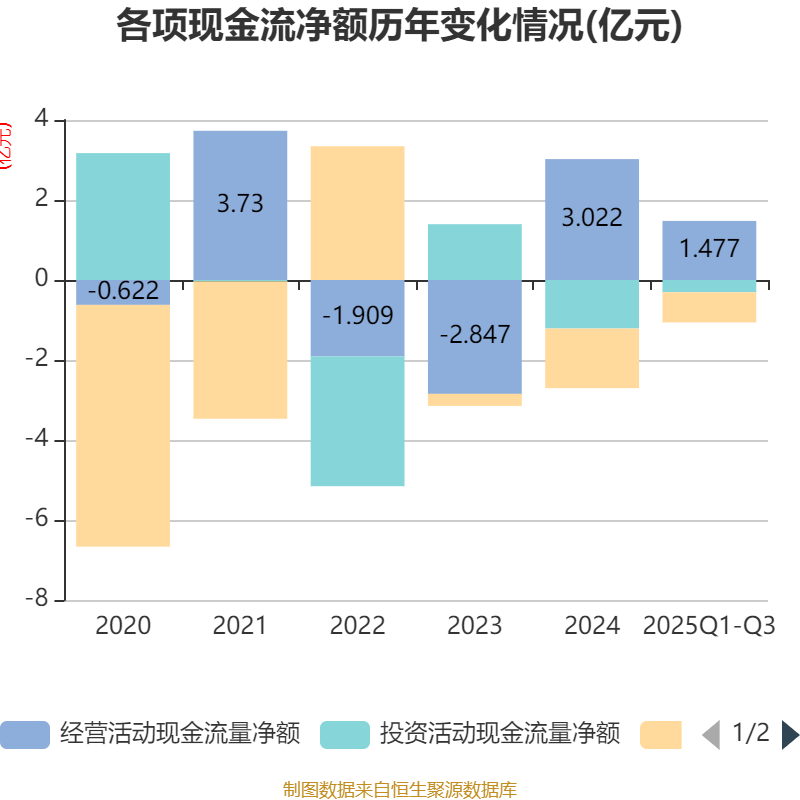 2025年前三季度,公司经营活动现金流净额为1.48亿元,同比增长401.7%;筹资活动现金流净额-7533.65万元,同比减少5942.32万元;投资活动现金流净额-3065.17万元,上年同期为-1.06亿元。