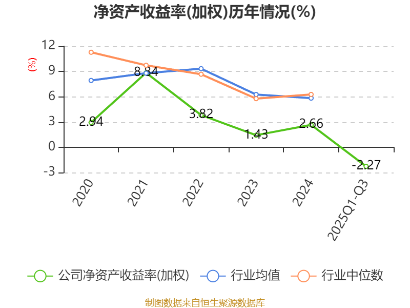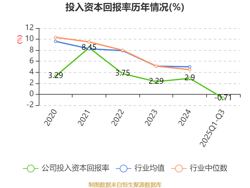 盈利能力方面, 2025年前三季度公司加权平均净资产收益率为-2.27%,同比下降5.02个百分点。公司2025年前三季度投入资本回报率为-0.71%,较上年同期下降3.31个百分点。