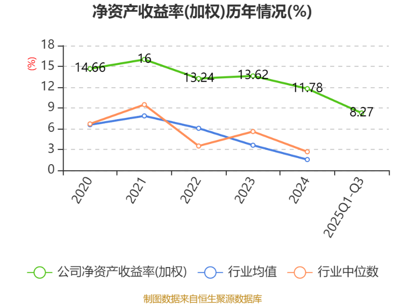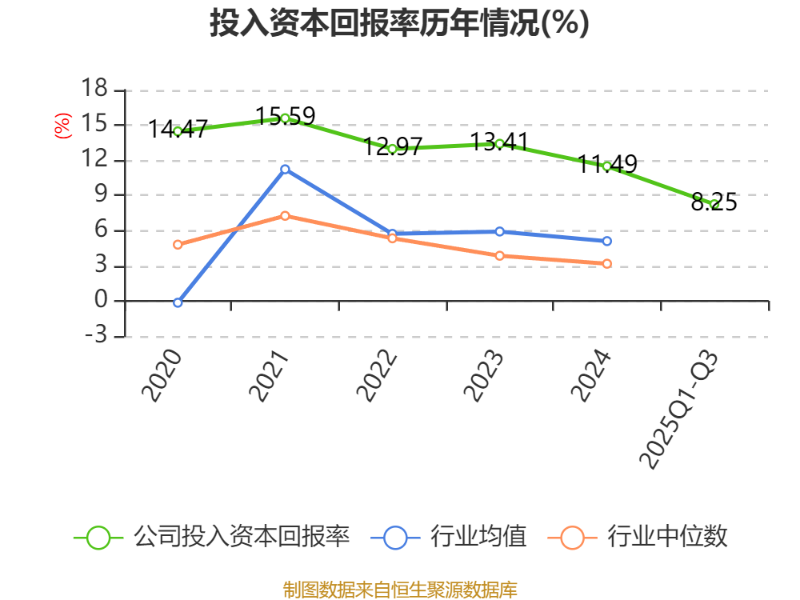 盈利能力方面, 2025年前三季度公司加权平均净资产收益率为8.27%,同比下降0.95个百分点。公司2025年前三季度投入资本回报率为8.25%,较上年同期下降1.01个百分点。