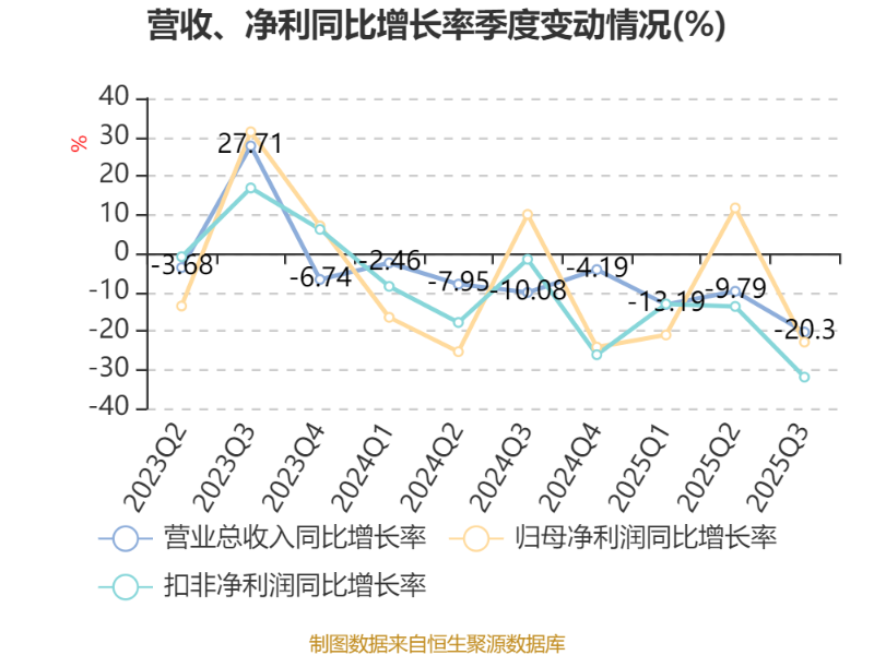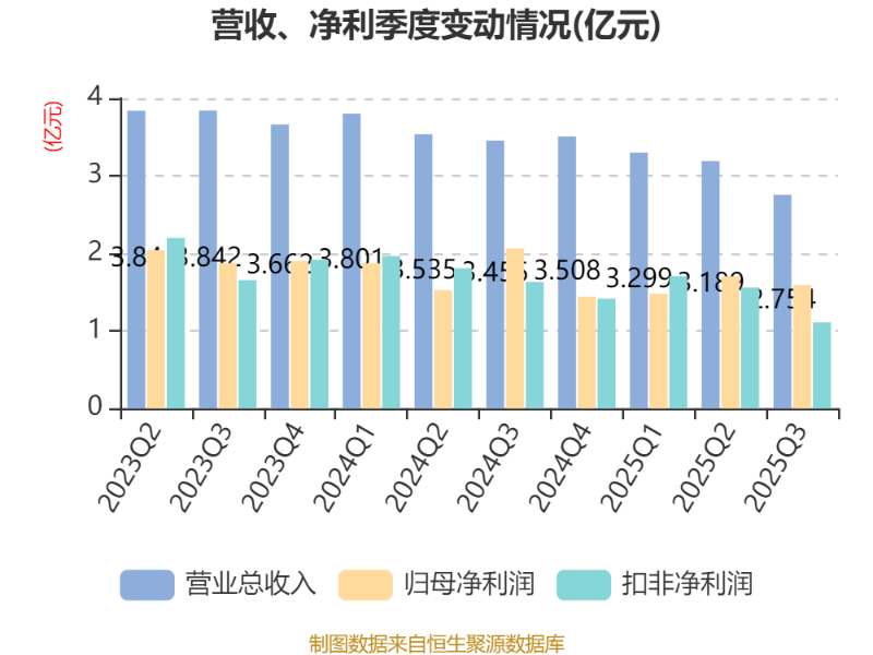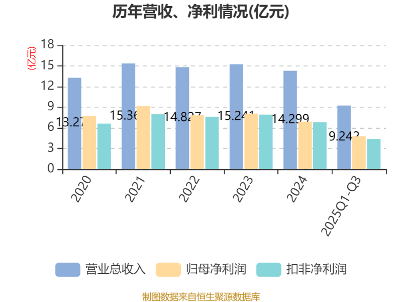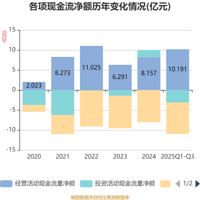 2025年前三季度,公司经营活动现金流净额为10.19亿元,同比增长15.44%;筹资活动现金流净额-7.86亿元,同比减少2.79亿元;投资活动现金流净额-3.13亿元,上年同期为-5882.53万元。