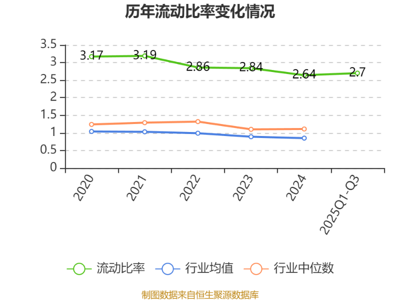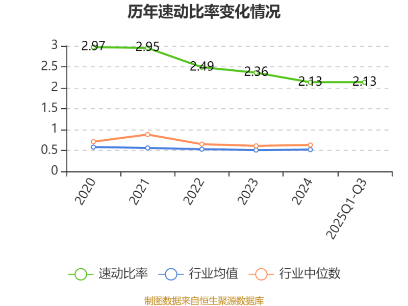 2025年前三季度,公司流动比率为2.7,速动比率为2.13。