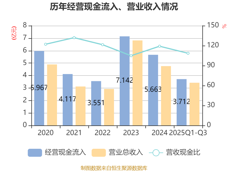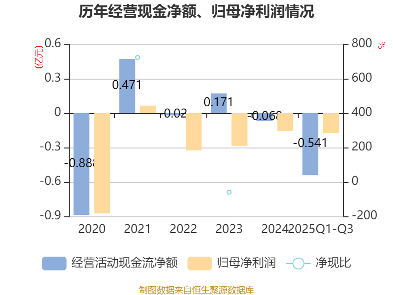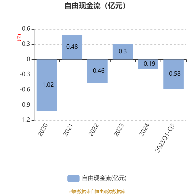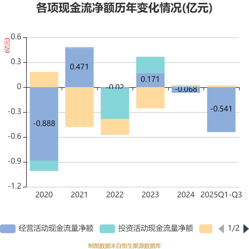 2025年前三季度,公司经营活动现金流净额为-5409.38万元,同比减少3307.59万元;筹资活动现金流净额200.87万元,同比减少103.42万元;投资活动现金流净额-6.91万元,上年同期为73.98万元。