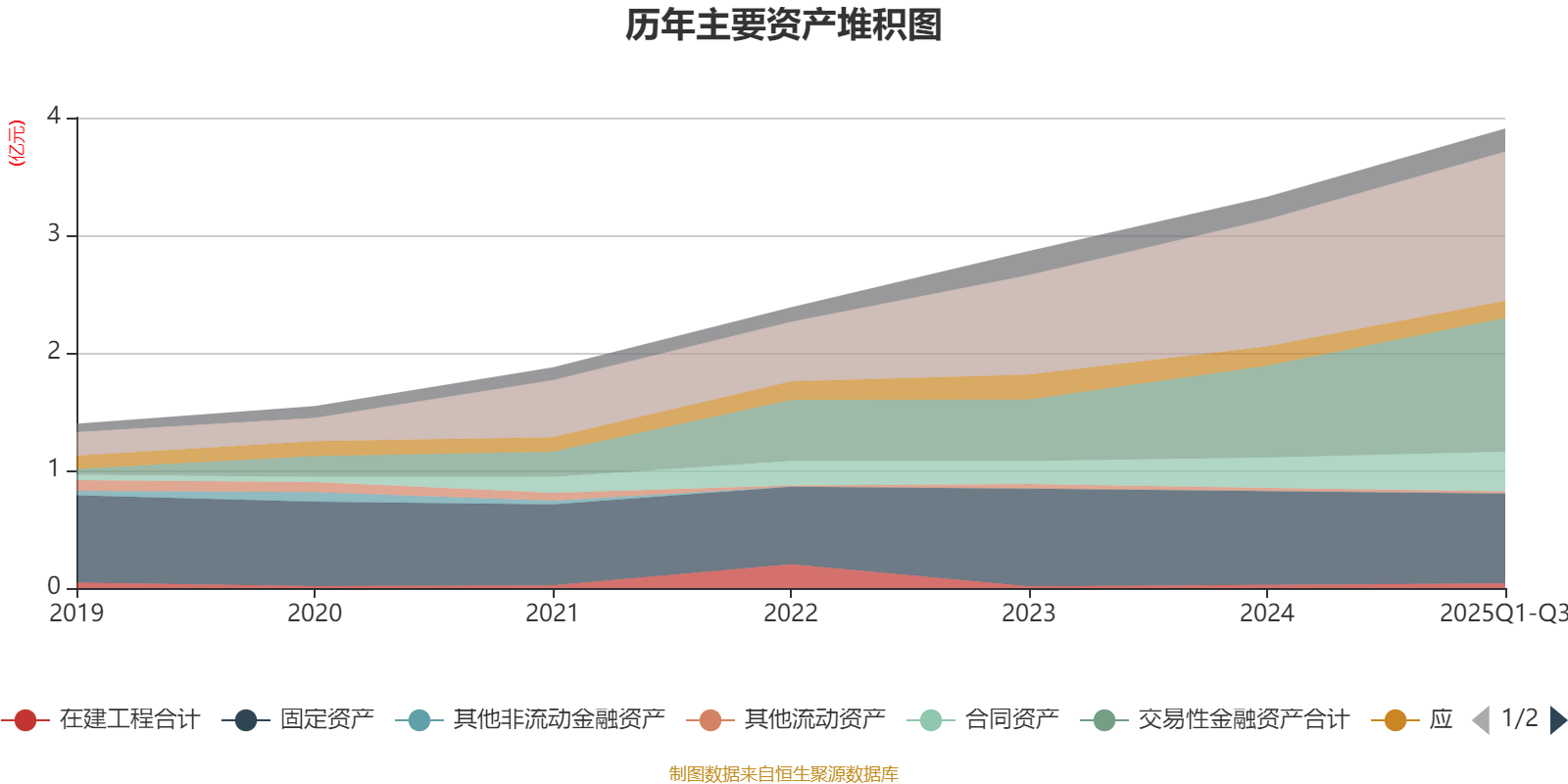 资产重大变化方面,截至2025年三季度末,公司交易性金融资产合计较上年末增加45.73%,占公司总资产比重上升5.66个百分点;固定资产较上年末减少4.15%,占公司总资产比重下降4.39个百分点;应收票据及应收账款较上年末减少12.27%,占公司总资产比重下降1.26个百分点;合同资产较上年末增加30.41%,占公司总资产比重上升0.86个百分点。