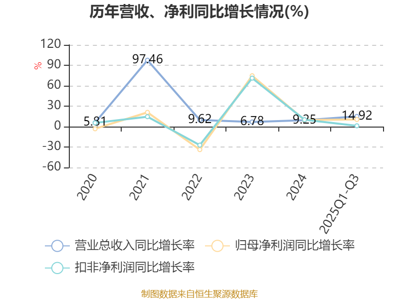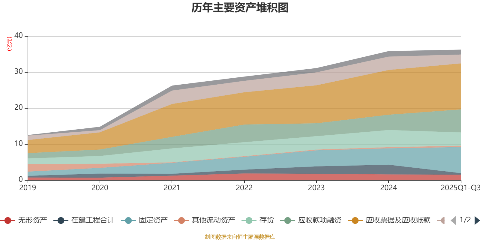 资产重大变化方面,截至2025年三季度末,公司固定资产较上年末增加58.26%,占公司总资产比重上升7.23个百分点;在建工程合计较上年末减少84.83%,占公司总资产比重下降6.37个百分点;应收款项融资较上年末增加50.58%,占公司总资产比重上升5.79个百分点;货币资金较上年末减少33.49%,占公司总资产比重下降3.57个百分点。