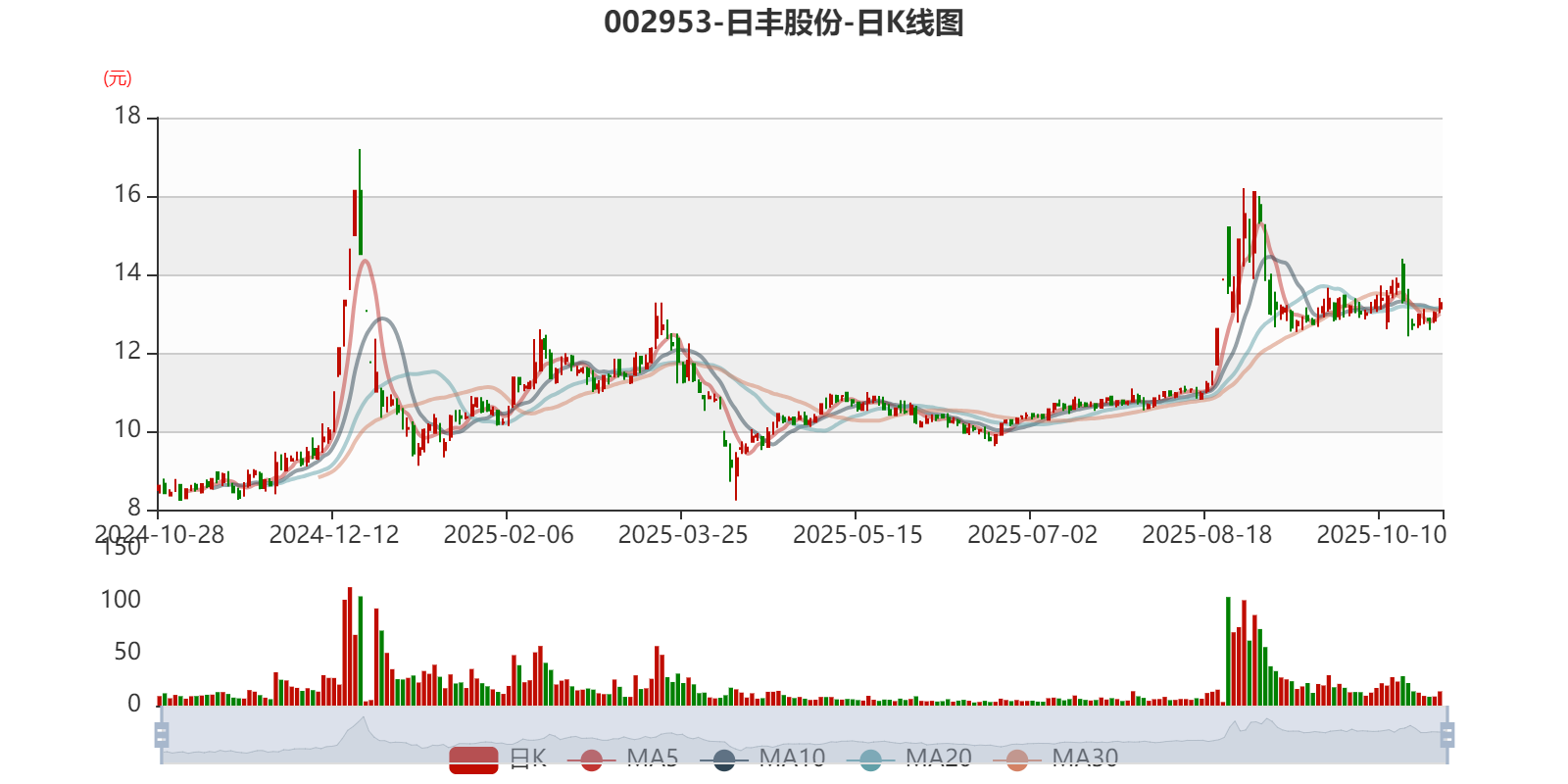 中证智能财讯日丰股份(002953)10月28日披露2025年第三季度报告。前三季度公司实现营业总收入35.18亿元,同比增长14.92%;归母净利润1.39亿元,同比增长10.40%;扣非净利润1.26亿元,同比增长1.14%;经营活动产生的现金流量净额为7896.85万元,同比增长155.02%;报告期内,日丰股份基本每股收益为0.3042元,加权平均净资产收益率为7.33%。