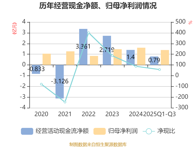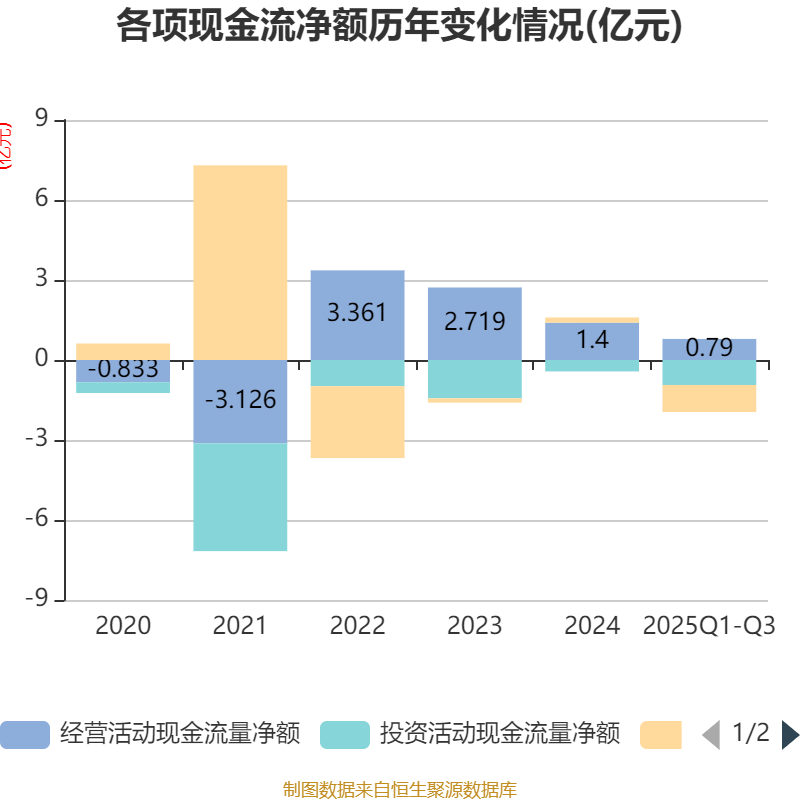 2025年前三季度,公司经营活动现金流净额为7896.85万元,同比增长155.02%;筹资活动现金流净额-1.02亿元,同比减少1.03亿元;投资活动现金流净额-9371.5万元,上年同期为-4250.3万元。