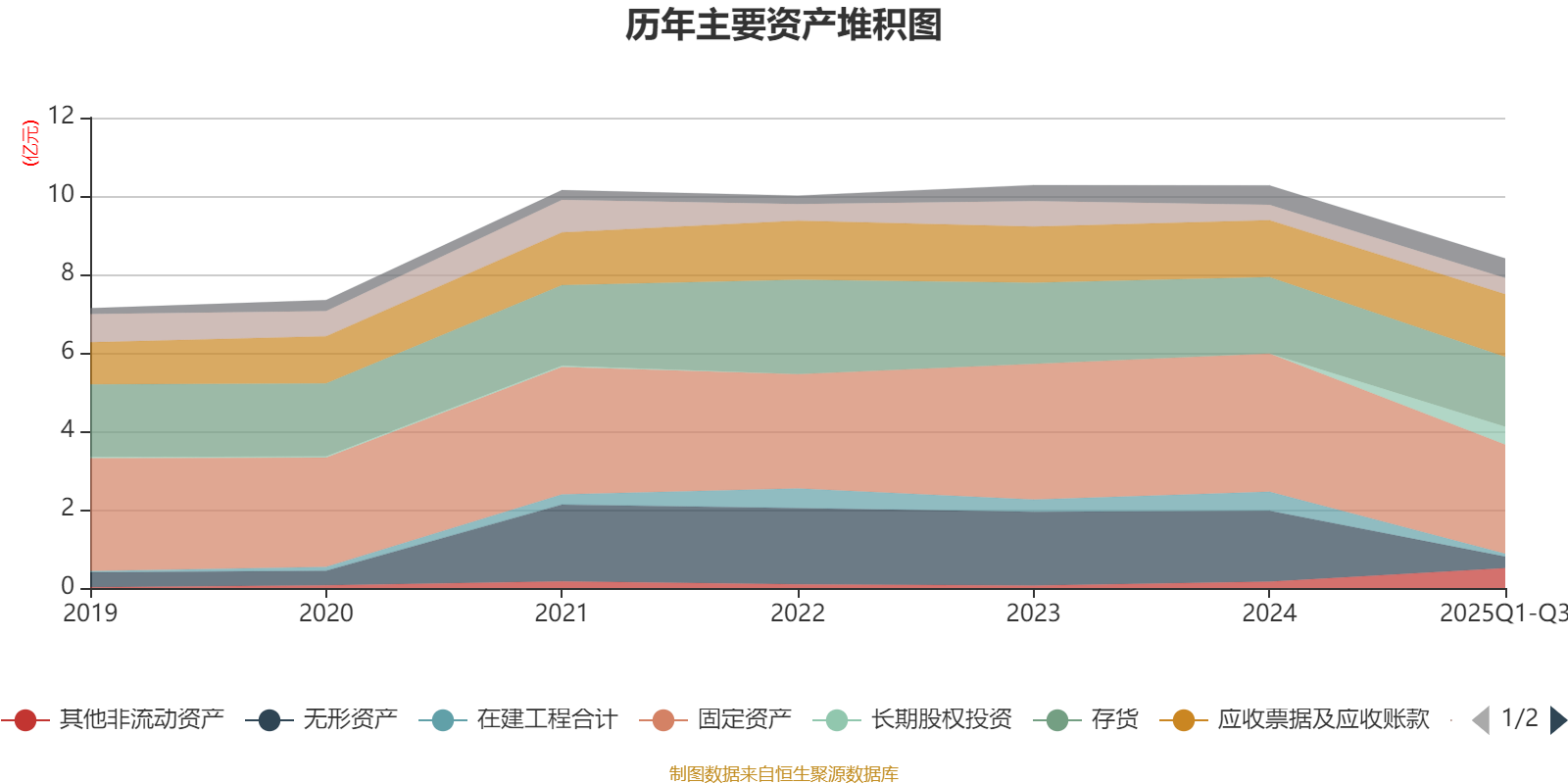 资产重大变化方面,截至2025年三季度末,公司无形资产较上年末减少83.9%,占公司总资产比重下降14.14个百分点;长期股权投资占公司总资产的5.43%,上年末为0;应收票据及应收账款较上年末增加9.85%,占公司总资产比重上升4.84个百分点;其他非流动资产较上年末增加215.5%,占公司总资产比重上升4.47个百分点。