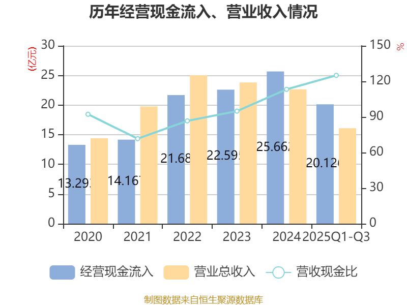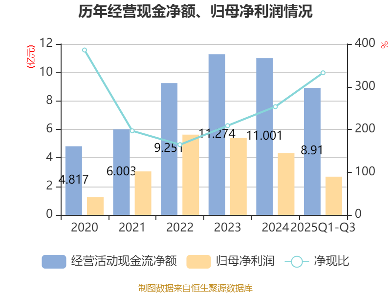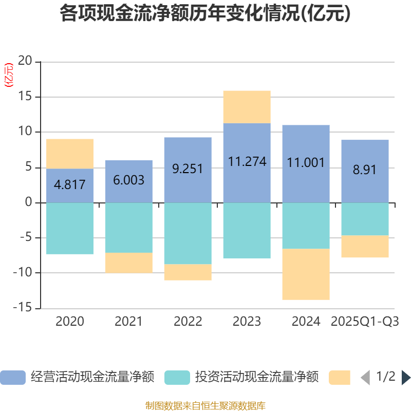 2025年前三季度,公司经营活动现金流净额为8.91亿元,同比增长10.56%;筹资活动现金流净额-3.12亿元,同比增加5.78亿元;投资活动现金流净额-4.68亿元,上年同期为-4.67亿元。