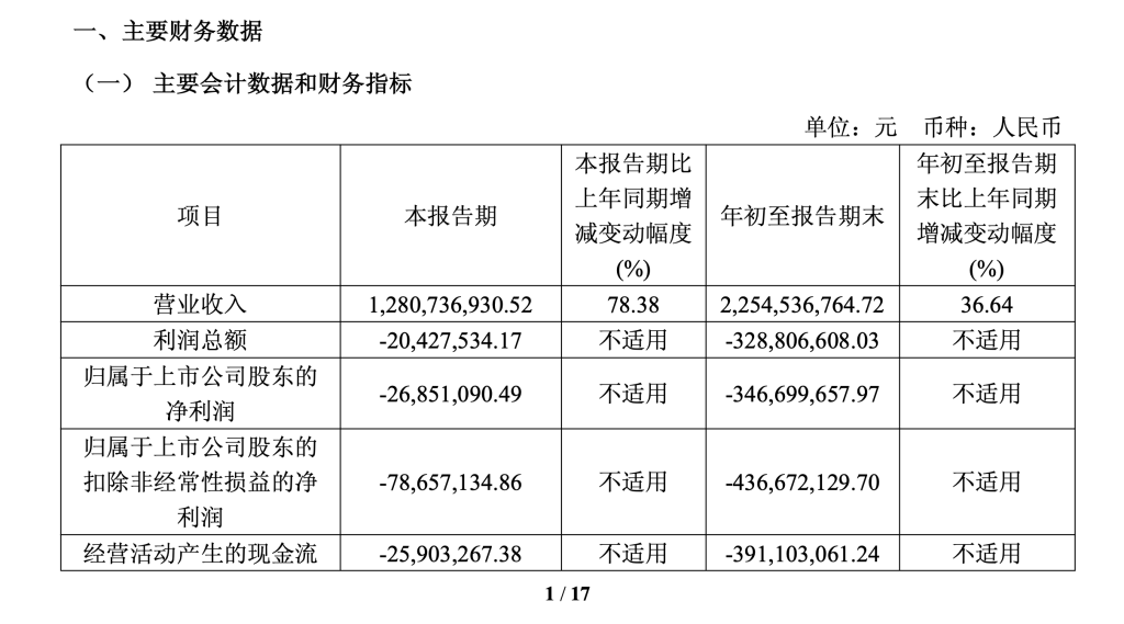 今年前三季度营收为22.45亿元,同比增长36.64%;前三季度归母净利润为-3.47亿元,扣非净利润为-4.37亿元。