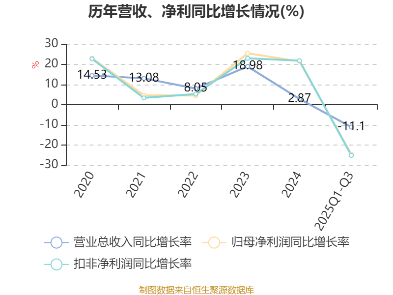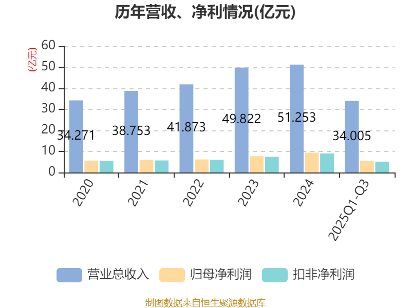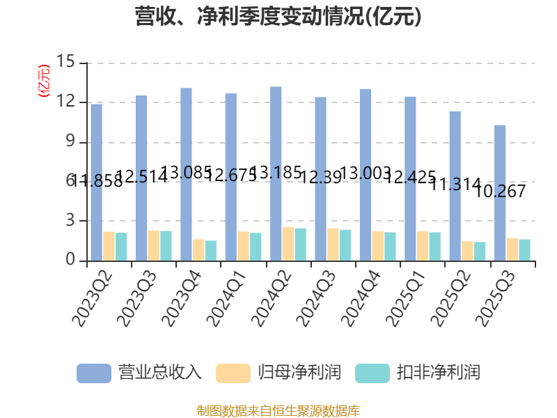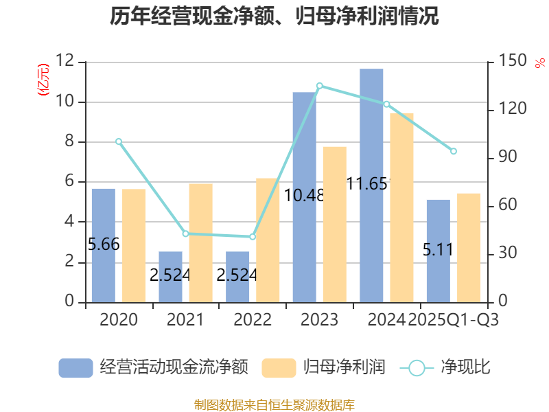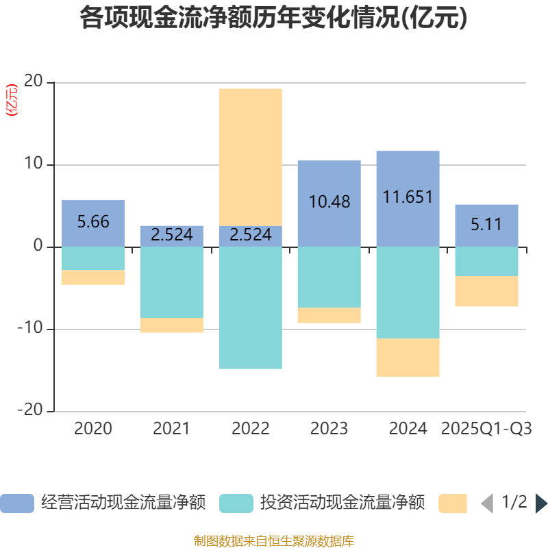 2025年前三季度,公司经营活动现金流净额为5.11亿元,同比下降37.16%;筹资活动现金流净额-3.7亿元,同比减少1.05亿元;投资活动现金流净额-3.58亿元,上年同期为-9.15亿元。