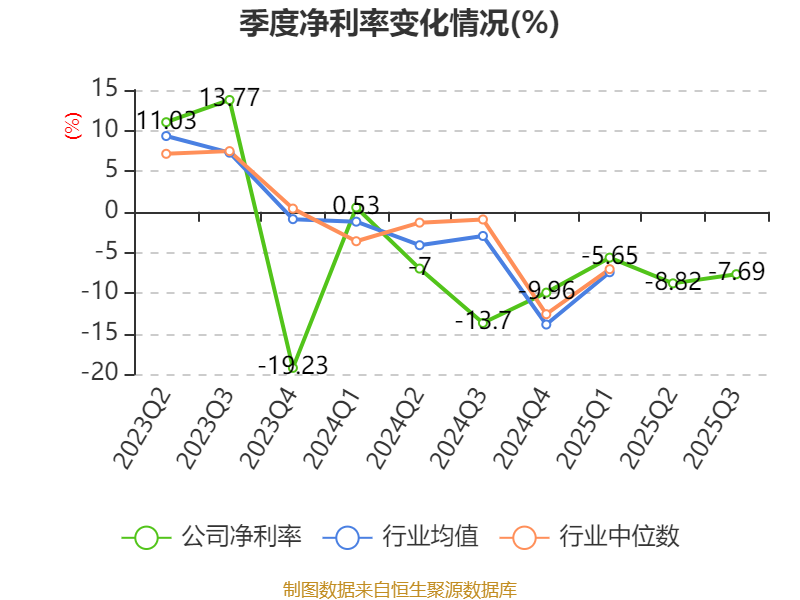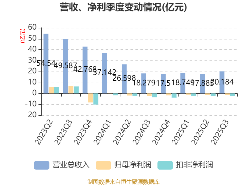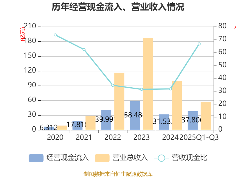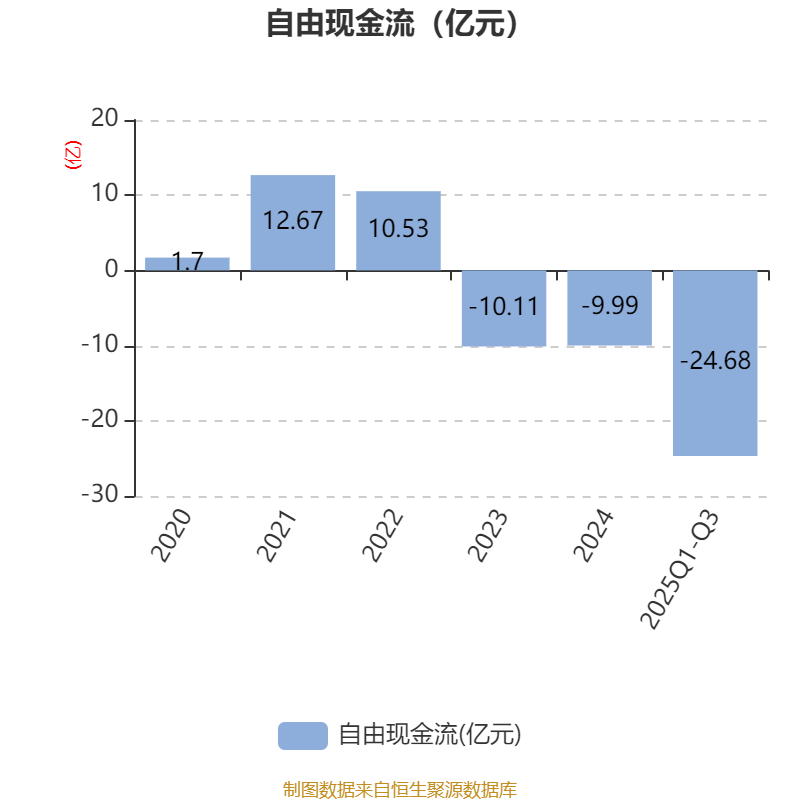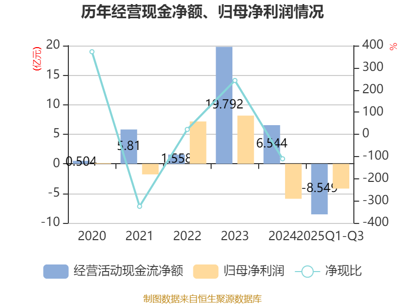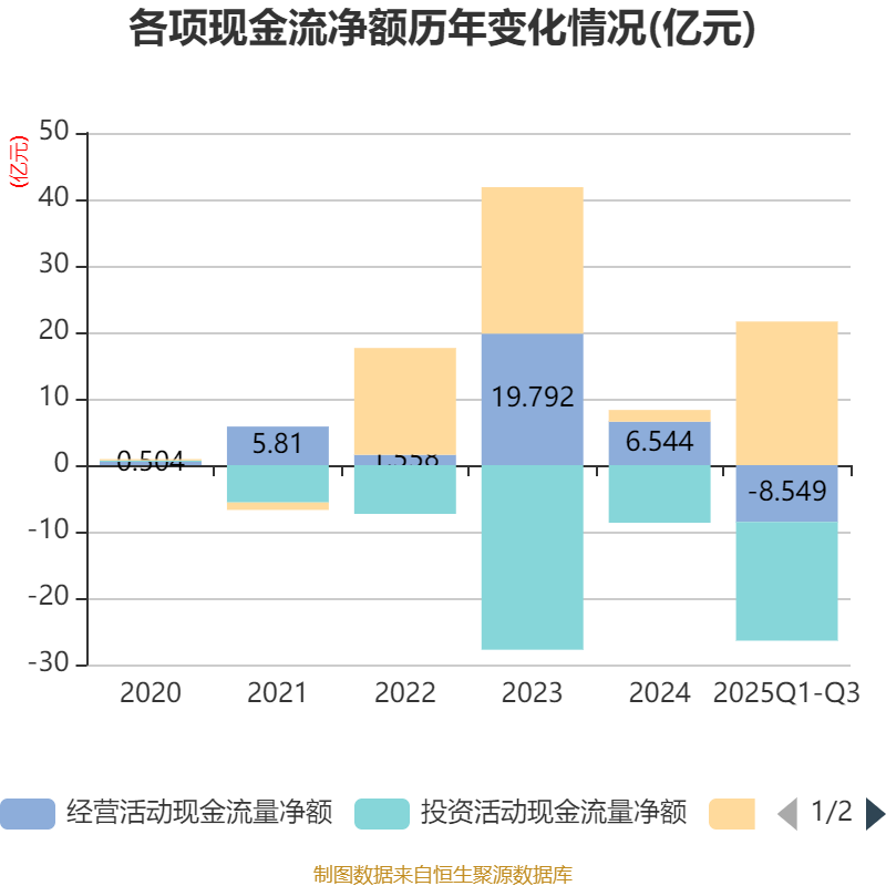 2025年前三季度,公司经营活动现金流净额为-8.55亿元,同比减少15.54亿元;筹资活动现金流净额21.61亿元,同比增加26.92亿元;投资活动现金流净额-17.87亿元,上年同期为-3.24亿元。