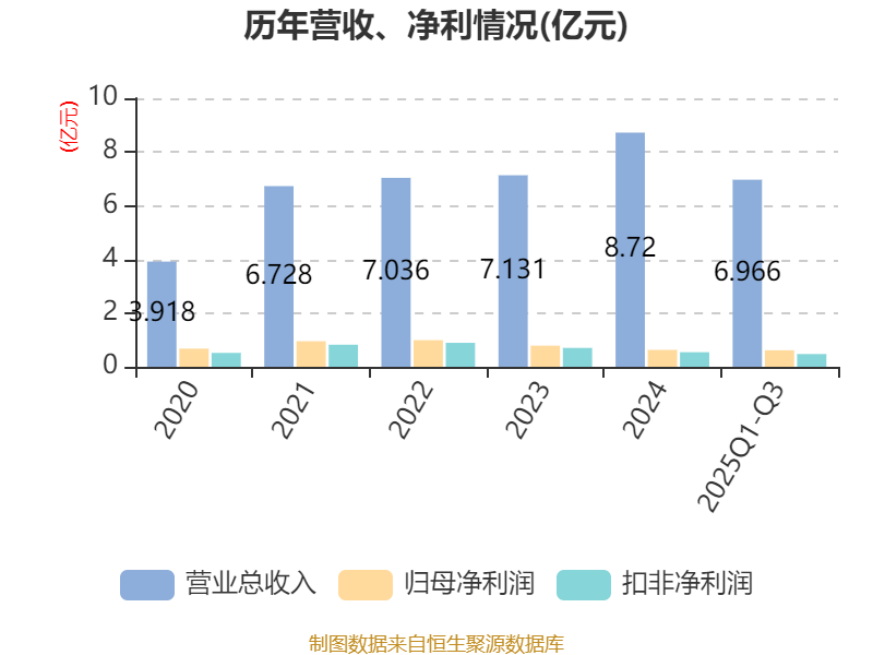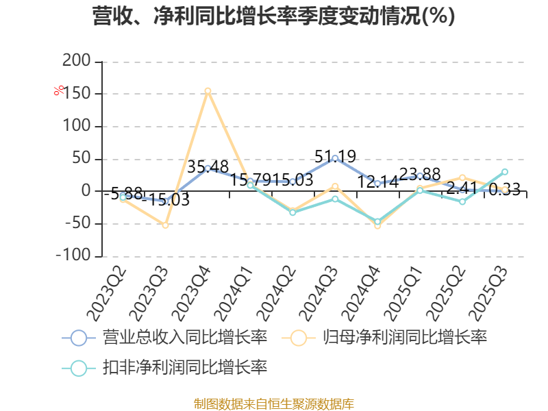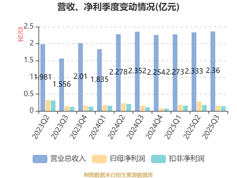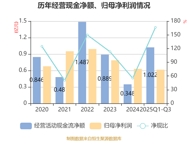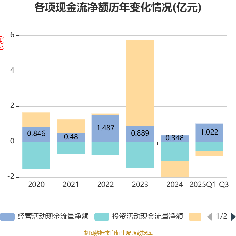2025年前三季度,公司经营活动现金流净额为1.02亿元,同比增长647.5%;筹资活动现金流净额-2822.78万元,同比增加5612.5万元;投资活动现金流净额-5180.82万元,上年同期为-1.01亿元。