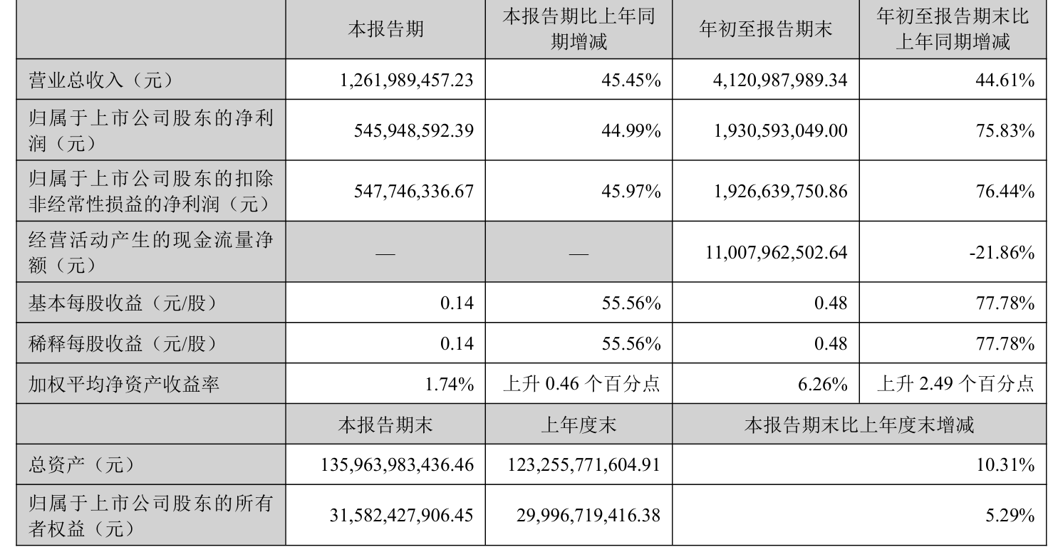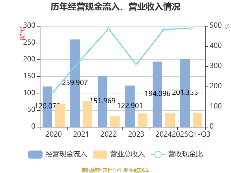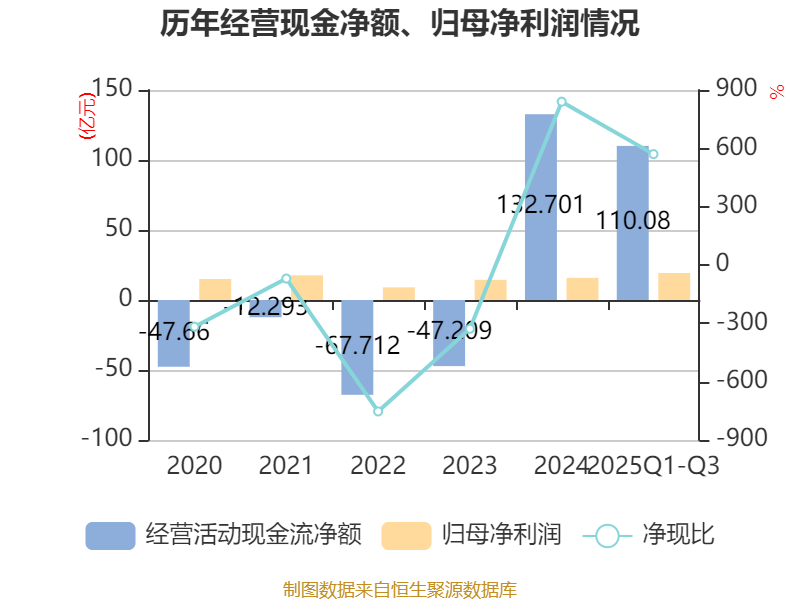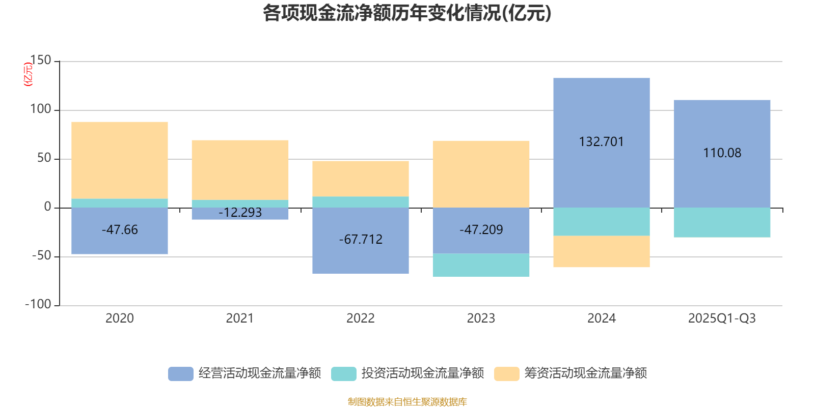 2025年前三季度,公司经营活动现金流净额为110.08亿元,同比下降21.86%;筹资活动现金流净额-1124.48万元,同比增加66.18亿元;投资活动现金流净额-30.5亿元,上年同期为-20.62亿元。