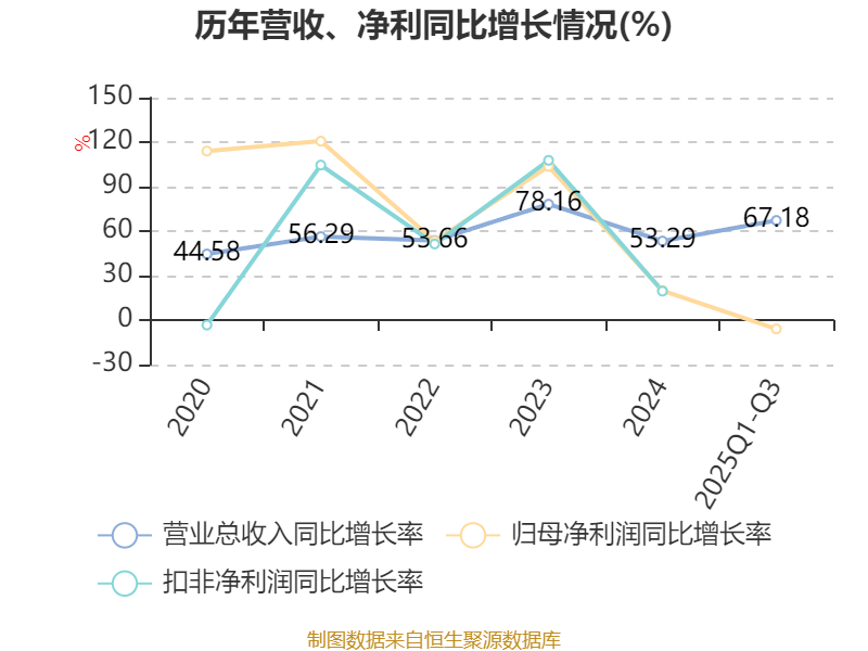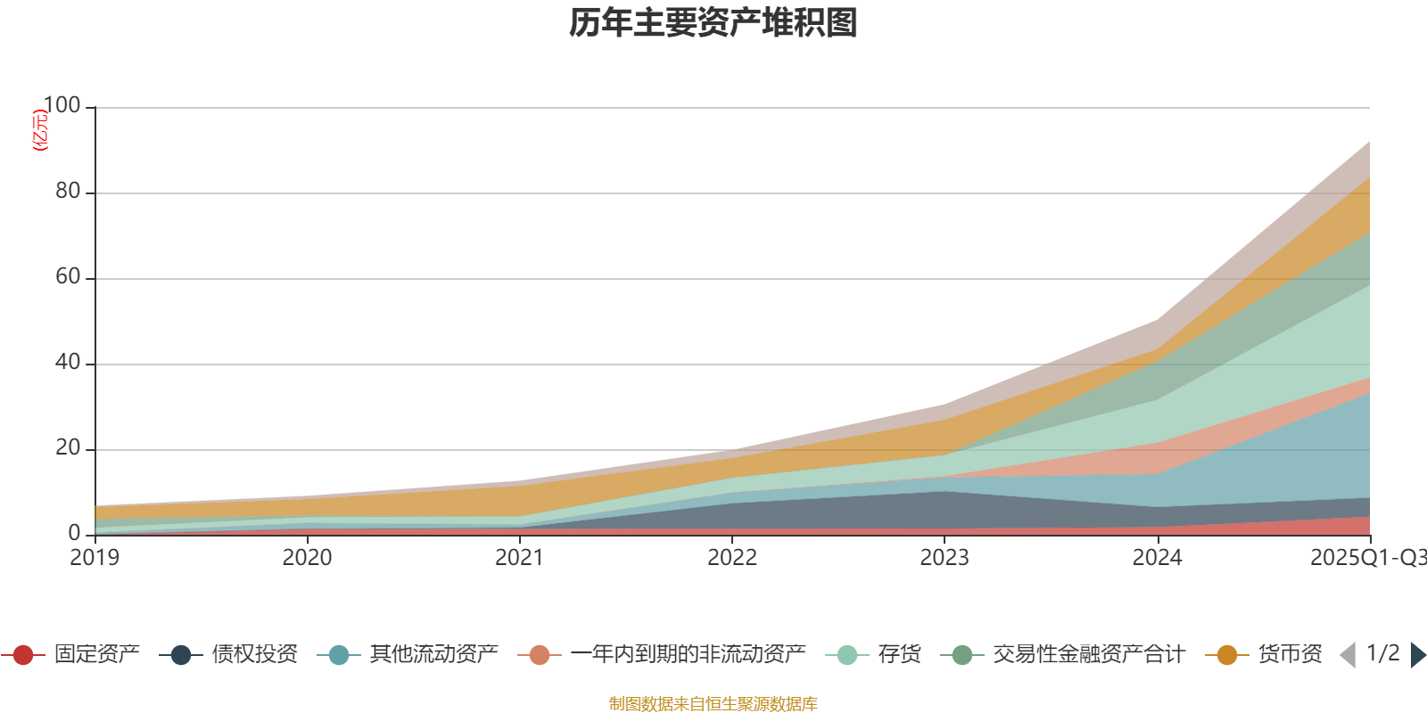 资产重大变化方面,截至2025年三季度末,公司其他流动资产较上年末增加215.62%,占公司总资产比重上升11.12个百分点;一年内到期的非流动资产较上年末减少49.47%,占公司总资产比重下降10.56个百分点;货币资金较上年末增加361.2%,占公司总资产比重上升8.47个百分点;交易性金融资产合计较上年末增加36.59%,占公司总资产比重下降4.59个百分点。