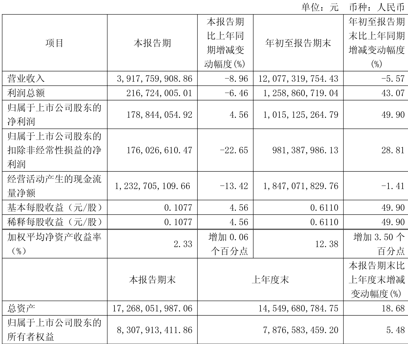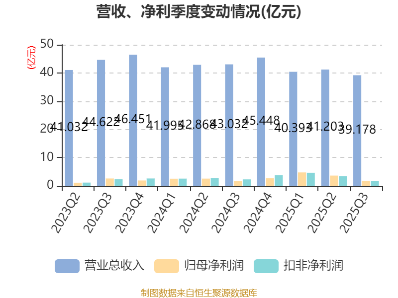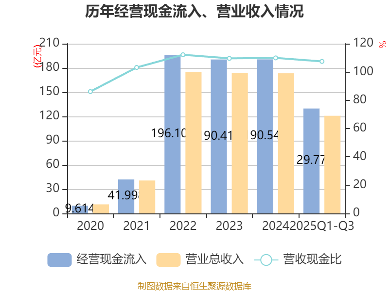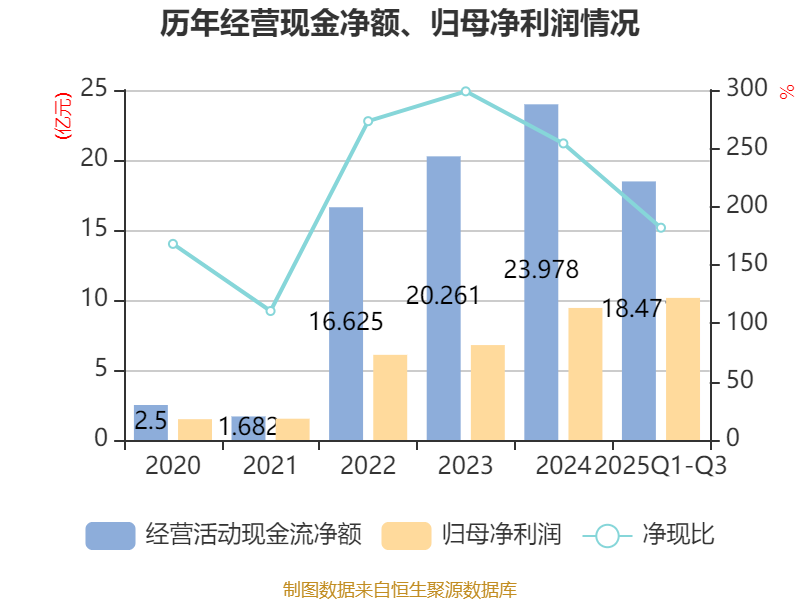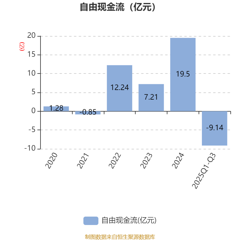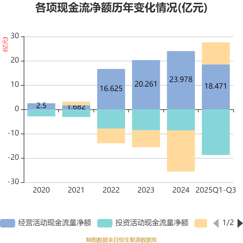 2025年前三季度,公司经营活动现金流净额为18.47亿元,同比下降1.41%;筹资活动现金流净额9.14亿元,同比增加21.44亿元;投资活动现金流净额-18.79亿元,上年同期为-5.32亿元。