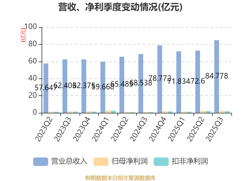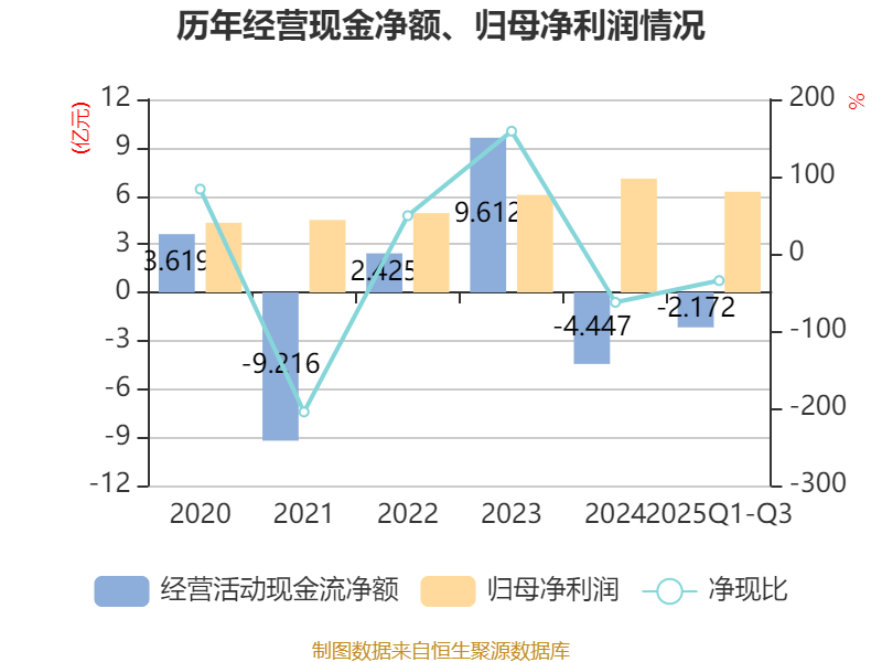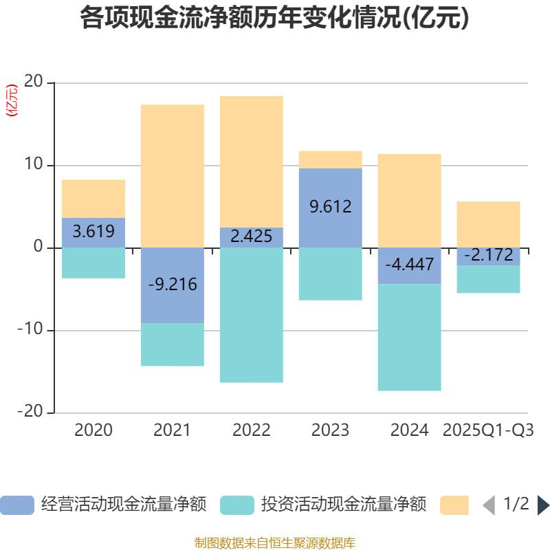 2025年前三季度,公司经营活动现金流净额为-2.17亿元,同比增加5.89亿元;筹资活动现金流净额5.57亿元,同比减少7.93亿元;投资活动现金流净额-3.35亿元,上年同期为-10.82亿元。