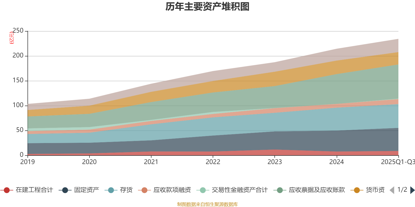 资产重大变化方面,截至2025年三季度末,公司货币资金较上年末减少8.46%,占公司总资产比重下降2.06个百分点;预付款项较上年末增加169.43%,占公司总资产比重上升1.66个百分点;其他流动资产较上年末减少25.94%,占公司总资产比重下降1.51个百分点;应收票据及应收账款较上年末增加14.79%,占公司总资产比重上升1.4个百分点。