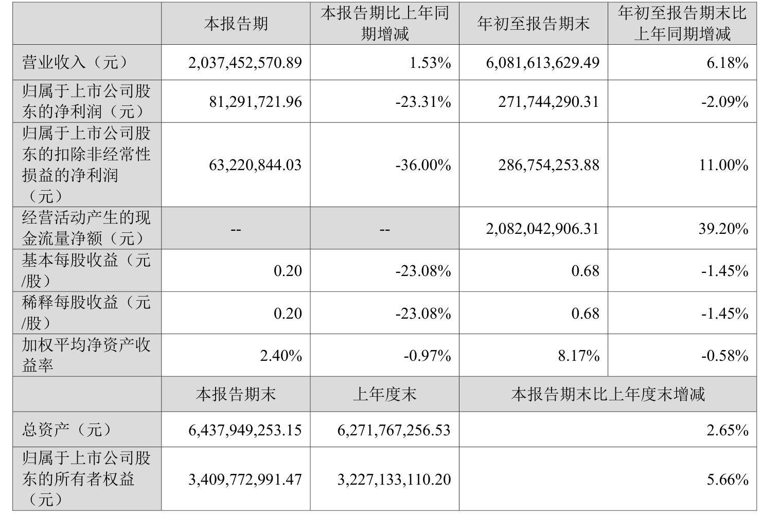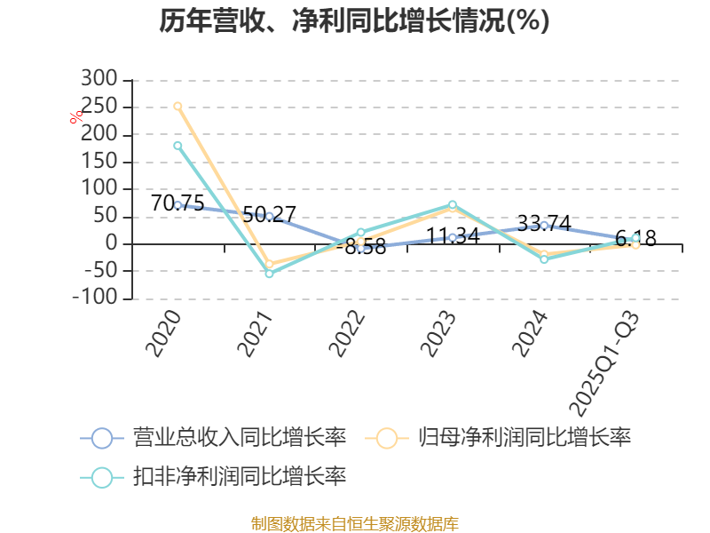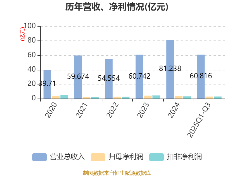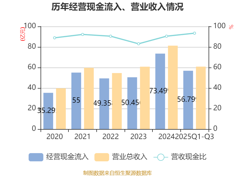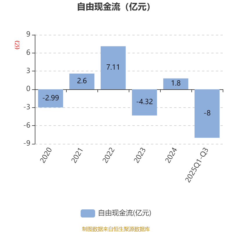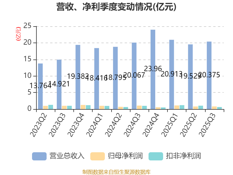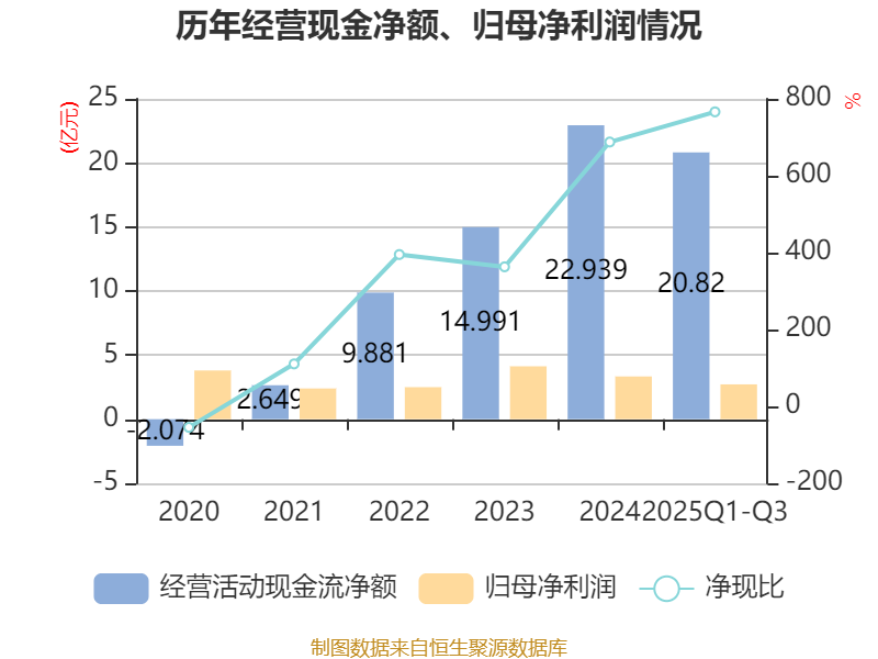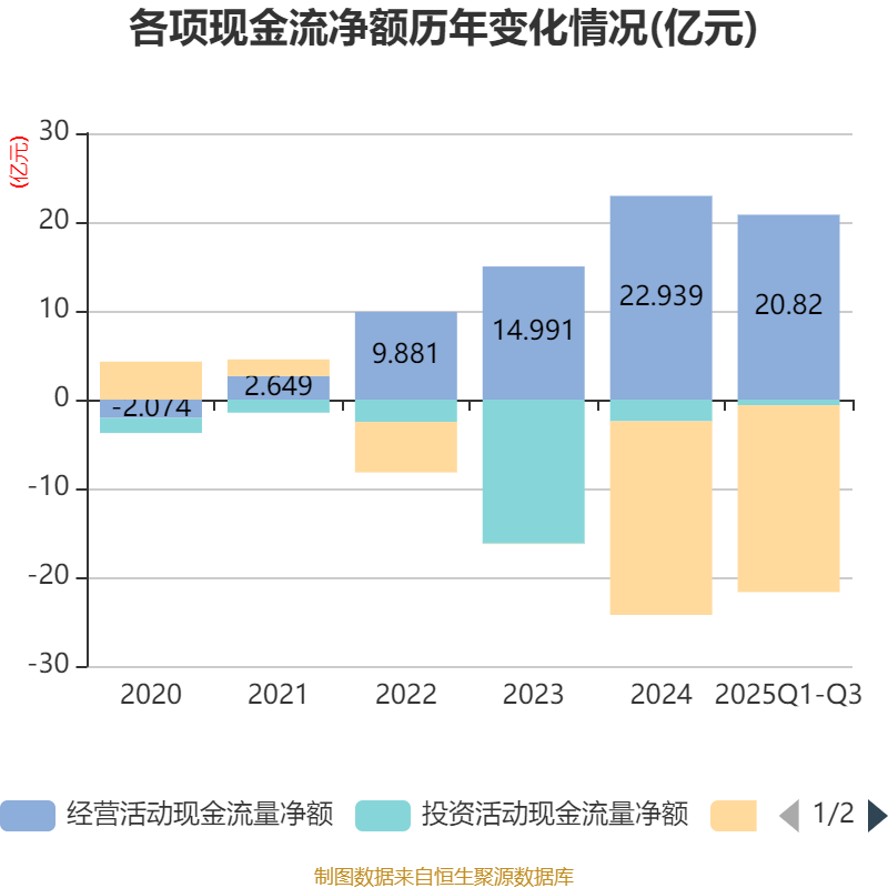 2025年前三季度,公司经营活动现金流净额为20.82亿元,同比增长39.2%;筹资活动现金流净额-21.04亿元,同比减少6.63亿元;投资活动现金流净额-6356.11万元,上年同期为-2.41亿元。