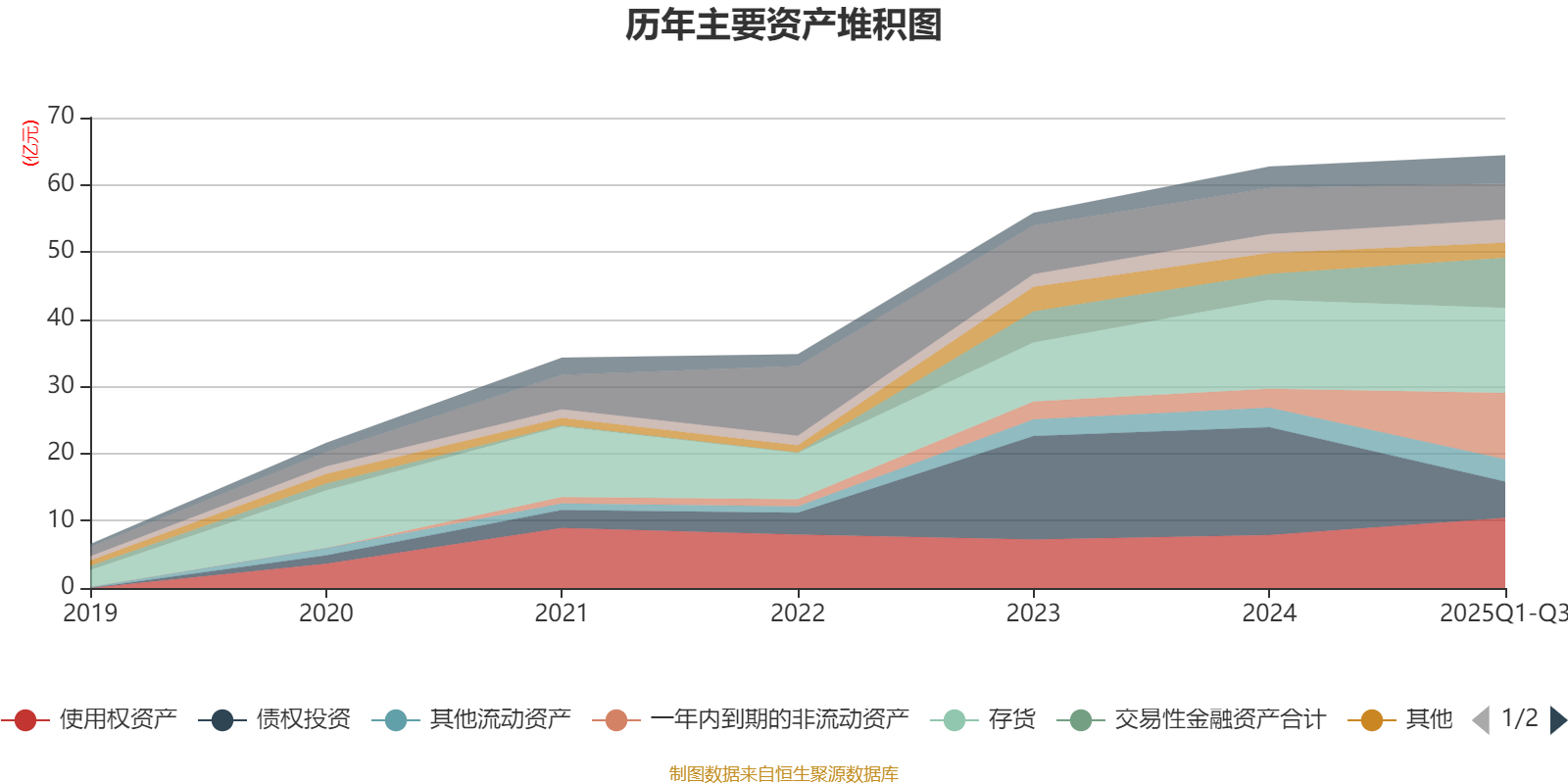资产重大变化方面,截至2025年三季度末,公司债权投资较上年末减少66.28%,占公司总资产比重下降17.18个百分点;一年内到期的非流动资产较上年末增加250.4%,占公司总资产比重上升10.83个百分点;交易性金融资产合计较上年末增加92.17%,占公司总资产比重上升5.39个百分点;使用权资产较上年末增加32.42%,占公司总资产比重上升3.64个百分点。