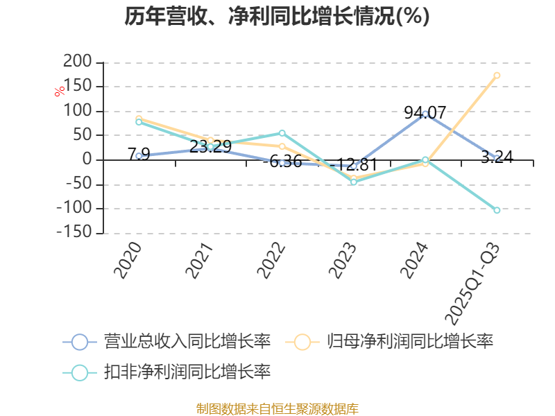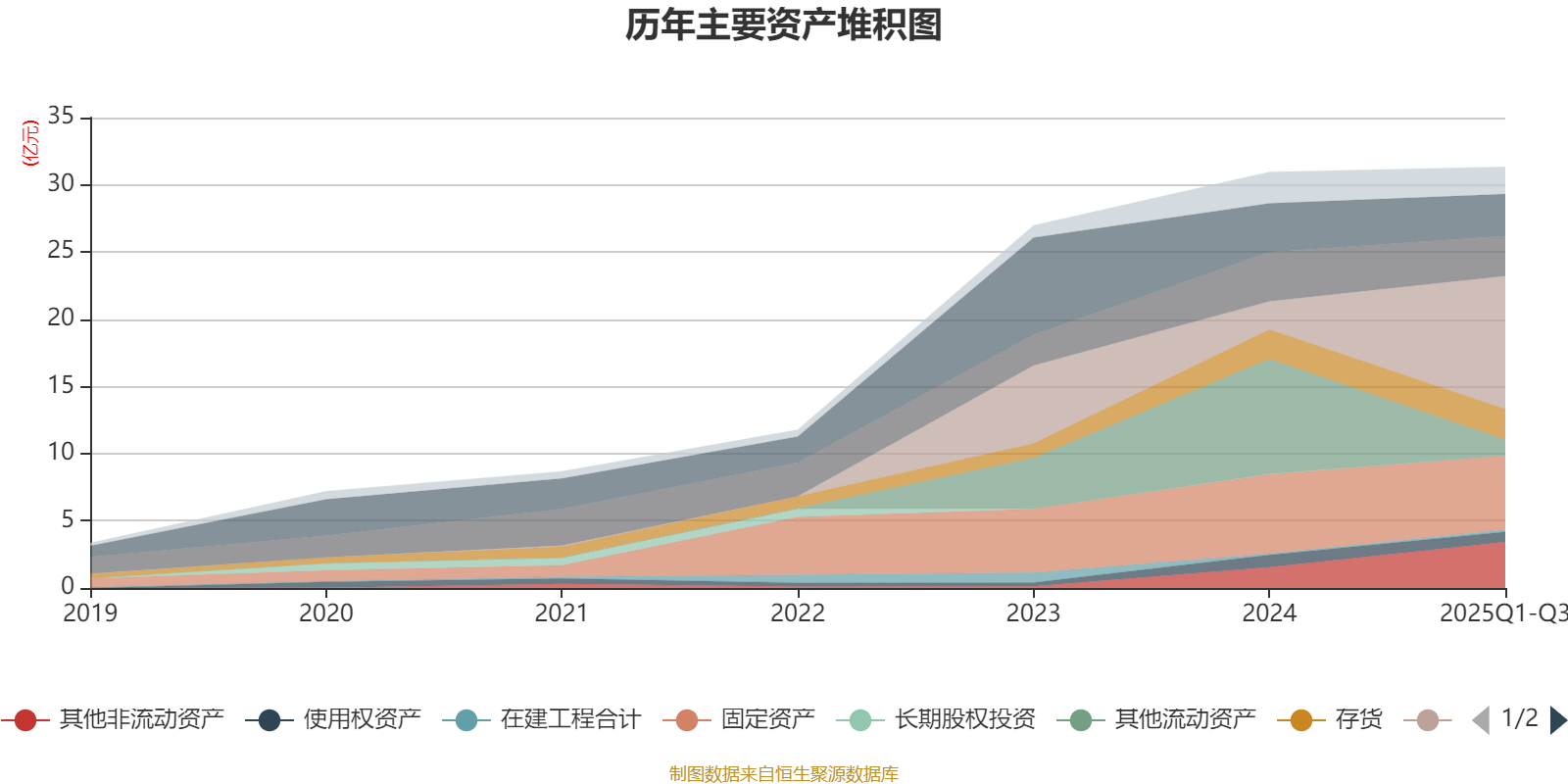 资产重大变化方面,截至2025年三季度末,公司交易性金融资产合计较上年末增加373.3%,占公司总资产比重上升24.85个百分点;其他流动资产较上年末减少86.14%,占公司总资产比重下降23.88个百分点;其他非流动资产较上年末增加121.11%,占公司总资产比重上升5.92个百分点;应收票据及应收账款较上年末减少18.5%,占公司总资产比重下降2.31个百分点。