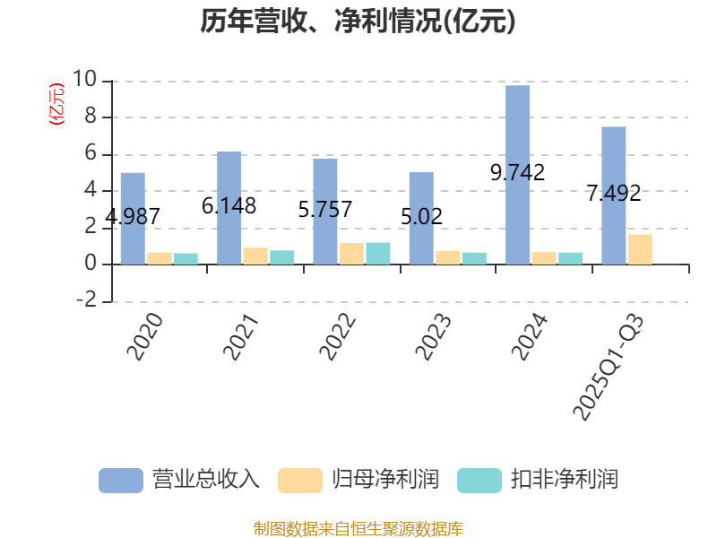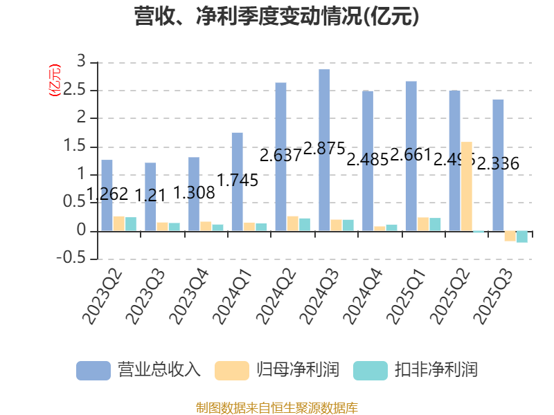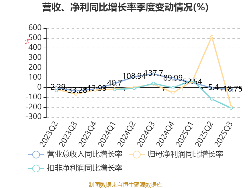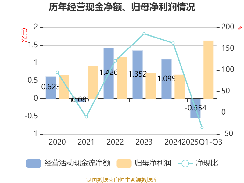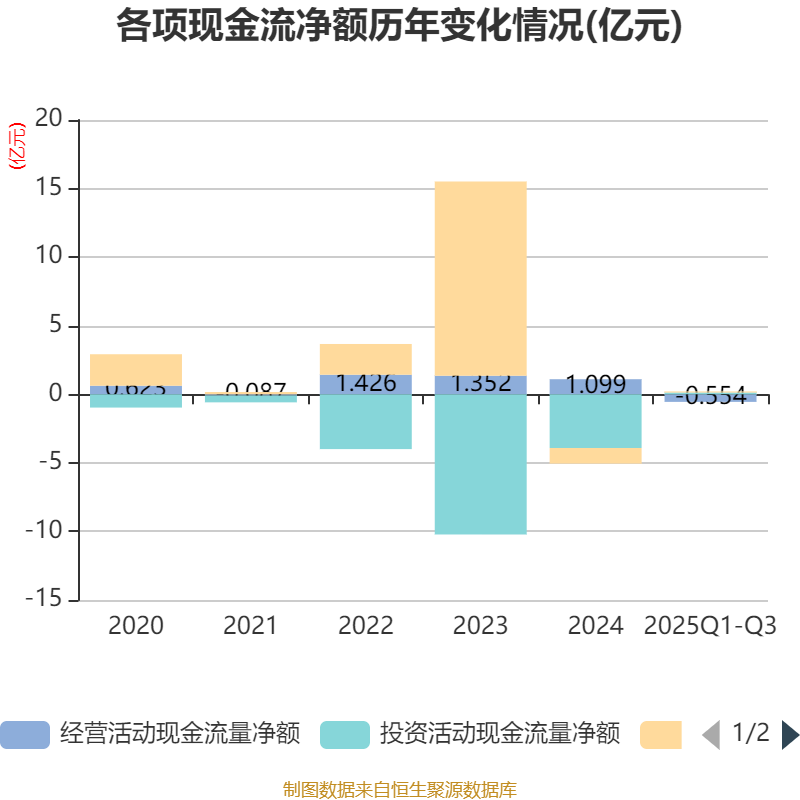 2025年前三季度,公司经营活动现金流净额为-5538.48万元,同比减少5802.96万元;筹资活动现金流净额785.99万元,同比增加1.15亿元;投资活动现金流净额1296.92万元,上年同期为-3.69亿元。
