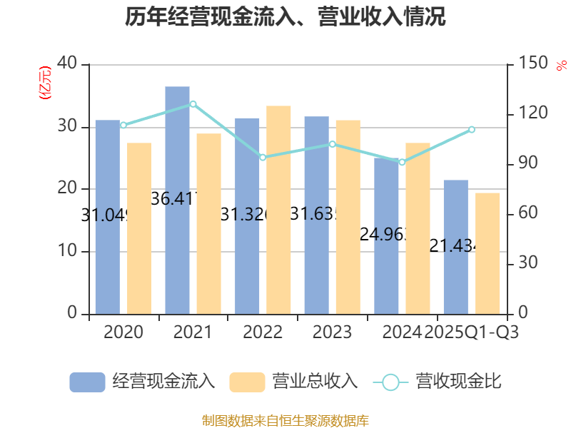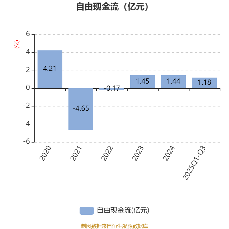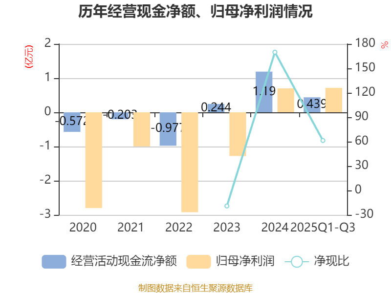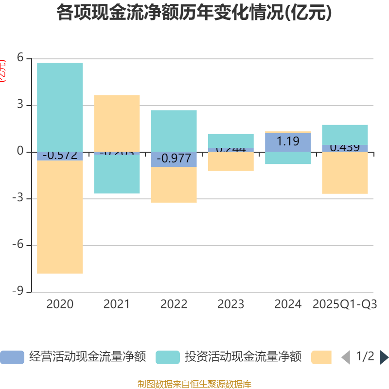 2025年前三季度,公司经营活动现金流净额为4393.54万元,同比增加1.08亿元;筹资活动现金流净额-2.71亿元,同比减少2.75亿元;投资活动现金流净额1.29亿元,上年同期为5732.89万元。