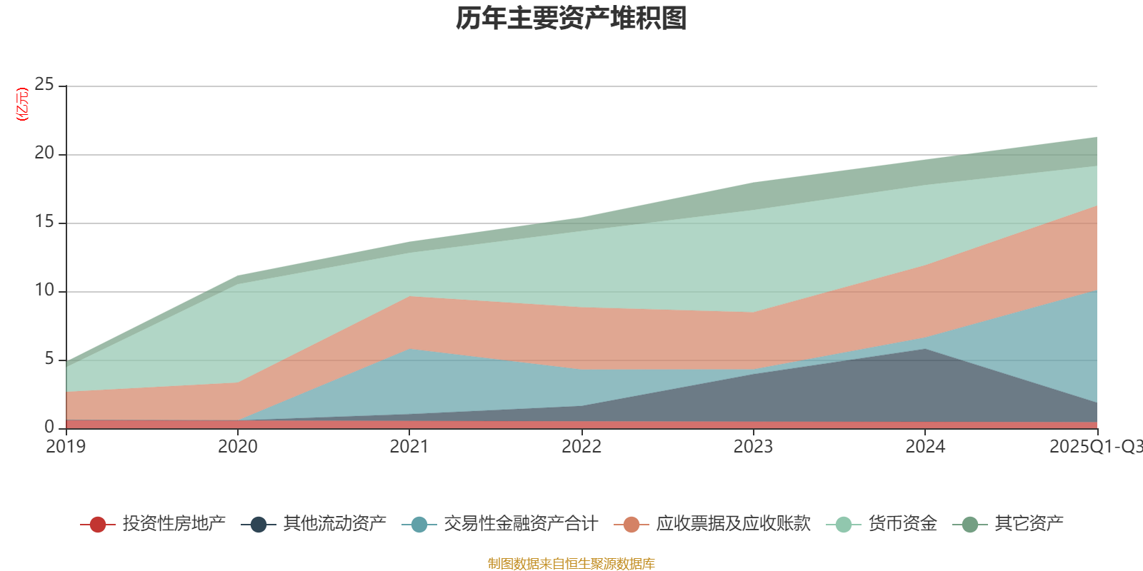 资产重大变化方面,截至2025年三季度末,公司交易性金融资产合计较上年末增加889.56%,占公司总资产比重上升34.49个百分点;其他流动资产较上年末减少73.39%,占公司总资产比重下降20.54个百分点;货币资金较上年末减少50.46%,占公司总资产比重下降16.21个百分点;应收票据及应收账款较上年末增加16.75%,占公司总资产比重上升2.06个百分点。