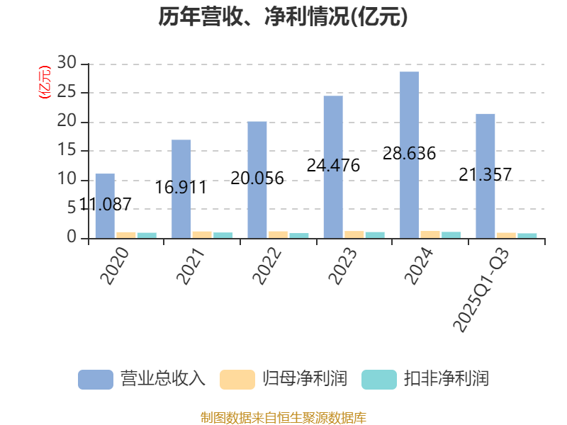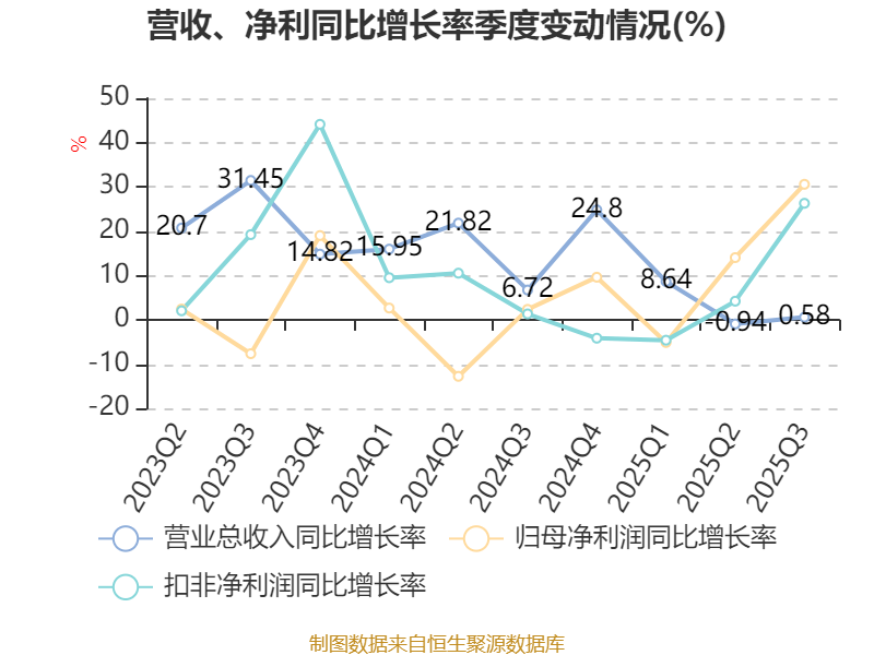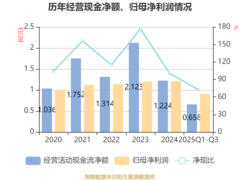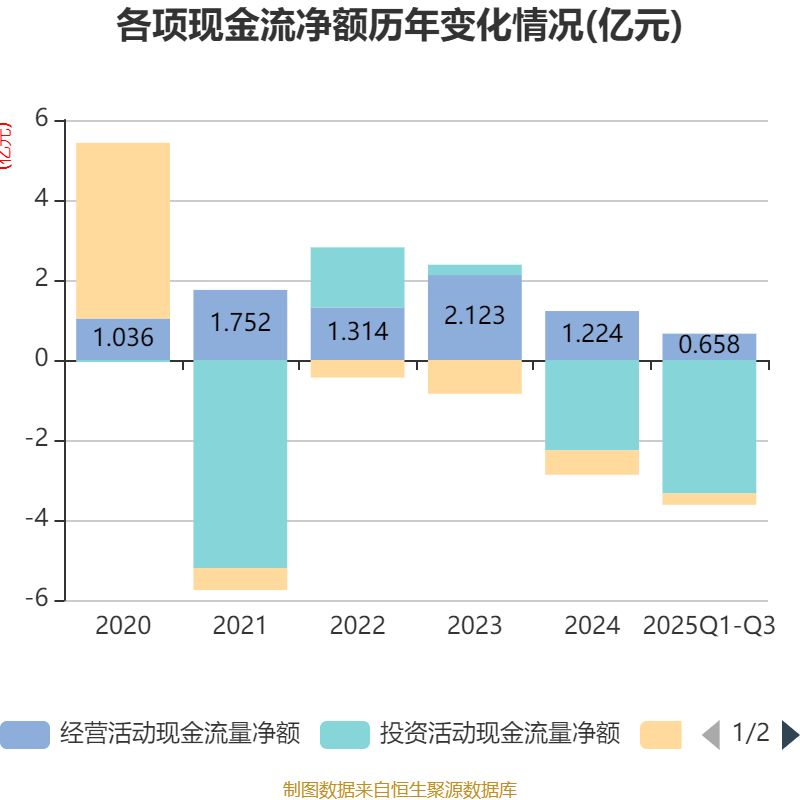 2025年前三季度,公司经营活动现金流净额为6575.91万元,同比增长29.21%;筹资活动现金流净额-2850.88万元,同比增加1880.22万元;投资活动现金流净额-3.33亿元,上年同期为-2.62亿元。