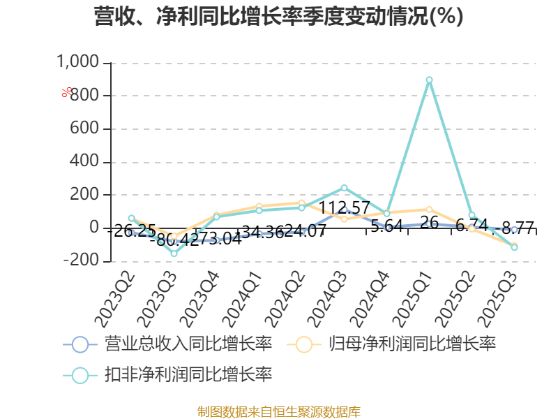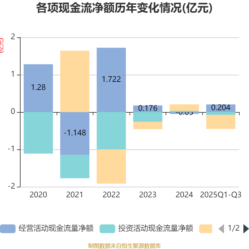 2025年前三季度,公司经营活动现金流净额为2040.19万元,同比增加7628.87万元;筹资活动现金流净额-3747.73万元,同比减少5518.02万元;投资活动现金流净额-756.3万元,上年同期为826万元。