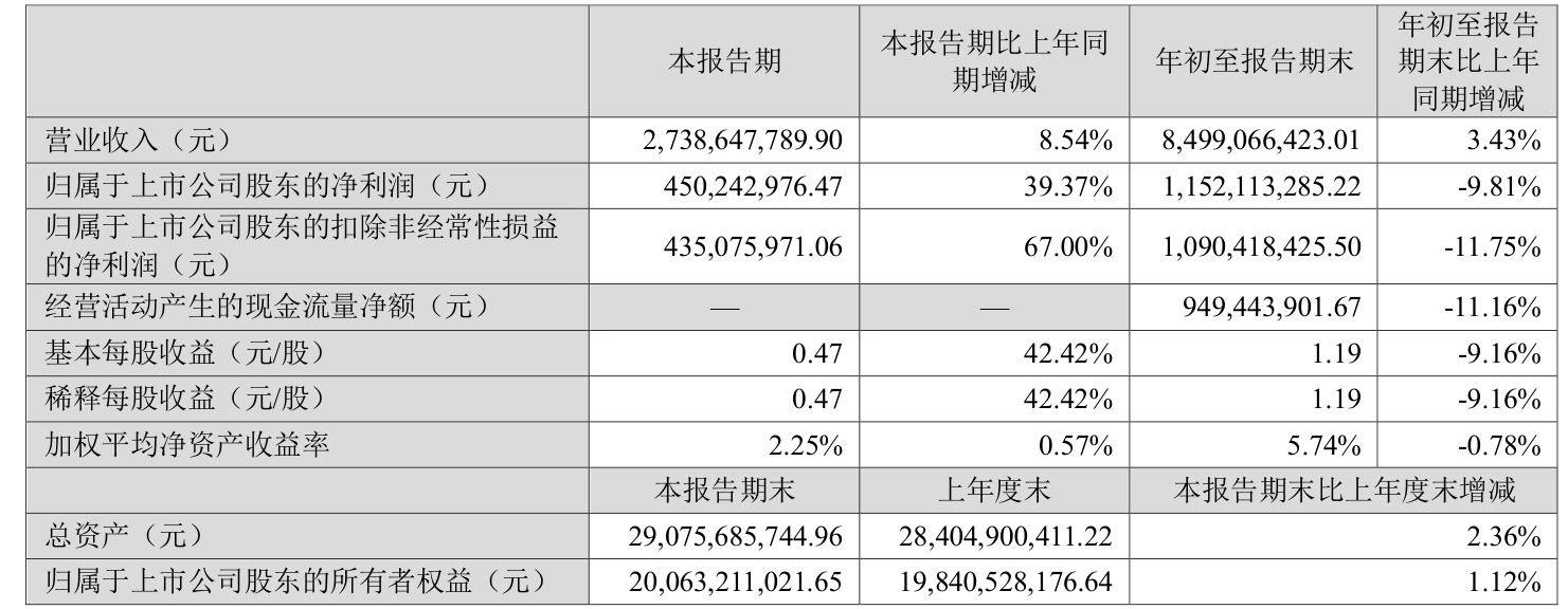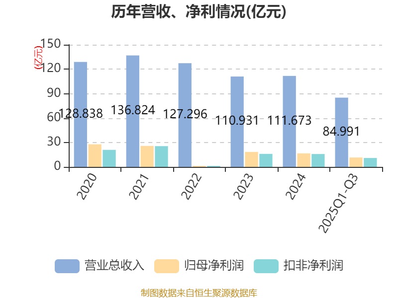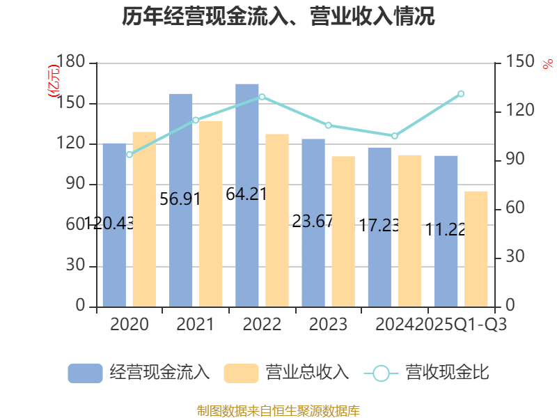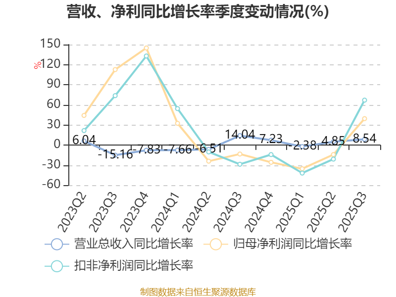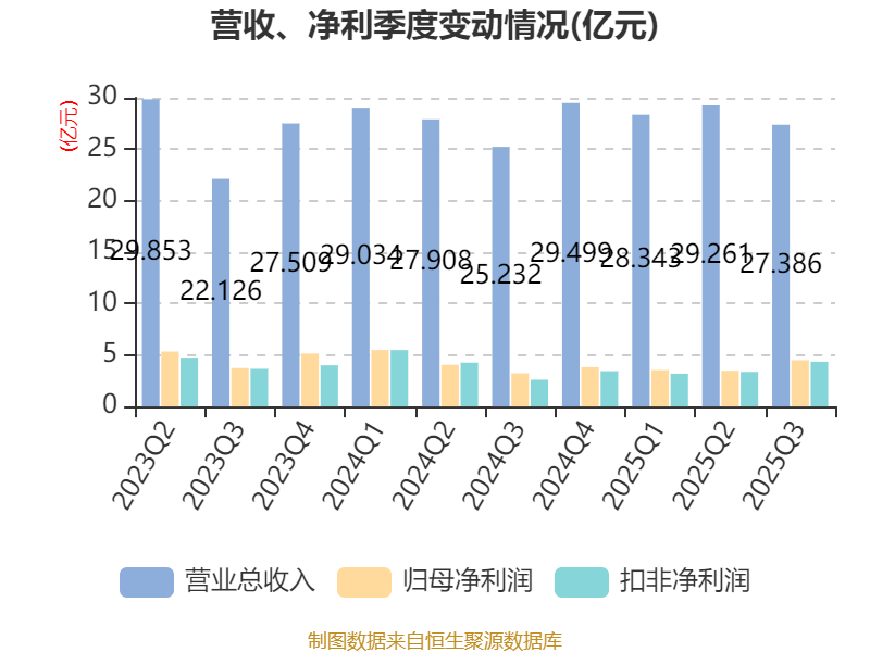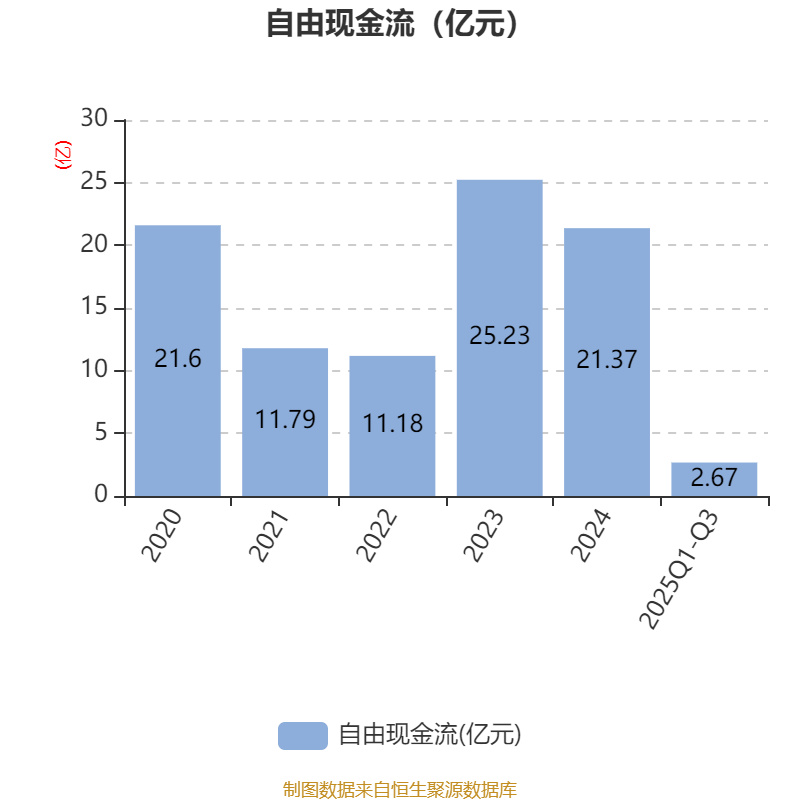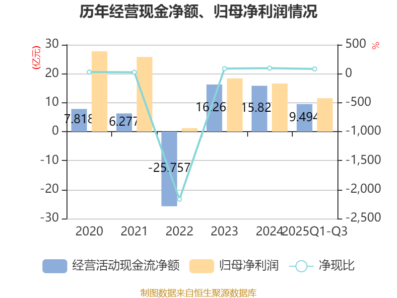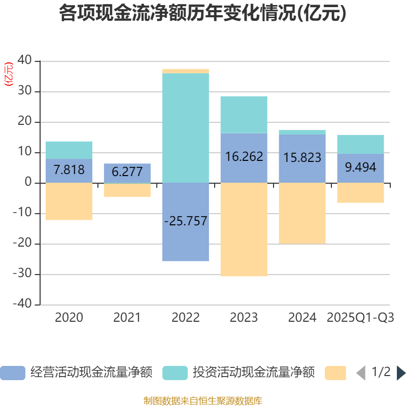 2025年前三季度,公司经营活动现金流净额为9.49亿元,同比下降11.16%;筹资活动现金流净额-6.6亿元,同比增加9.69亿元;投资活动现金流净额6.18亿元,上年同期为9.05亿元。