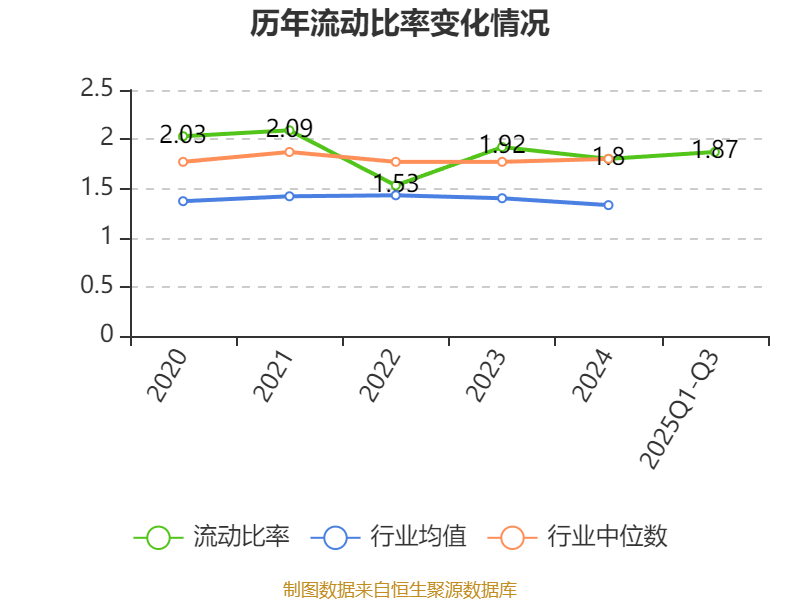 2025年前三季度,公司流动比率为1.87,速动比率为1.53。