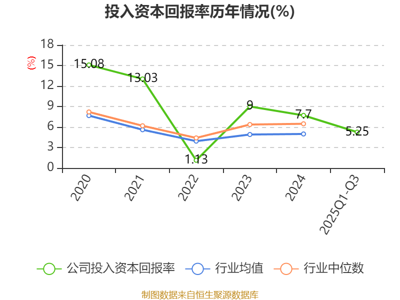 盈利能力方面, 2025年前三季度公司加权平均净资产收益率为5.74%,同比下降0.78个百分点。公司2025年前三季度投入资本回报率为5.25%,较上年同期下降1个百分点。