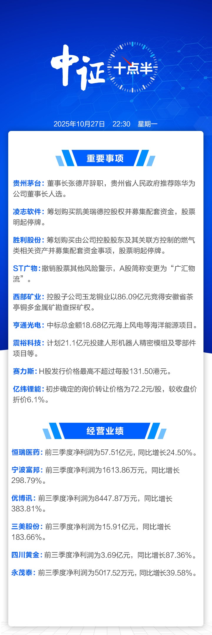 【中证十点半】筹划购买凯美瑞德控股权,凌志软件明起停牌;西部矿业86亿元竞得安徽铜多金属矿探矿权