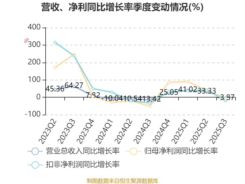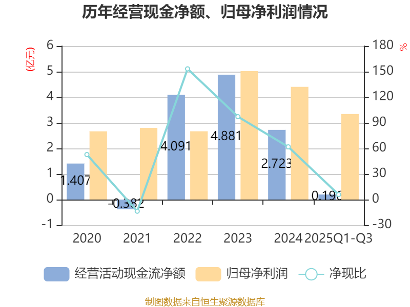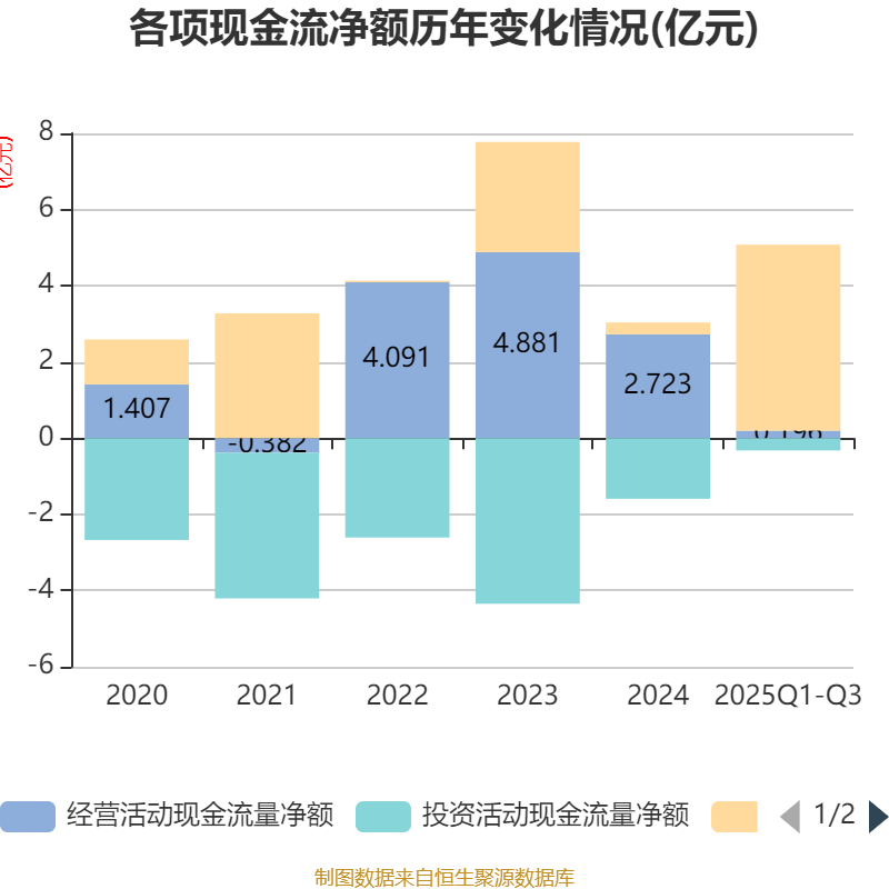2025年前三季度,公司经营活动现金流净额为1963.66万元,同比增加5962.12万元;筹资活动现金流净额4.88亿元,同比增加4.4亿元;投资活动现金流净额-3222.26万元,上年同期为-1.63亿元。