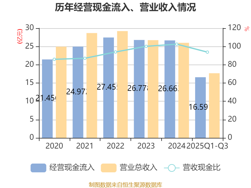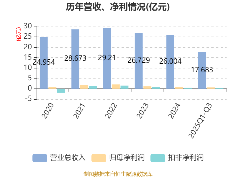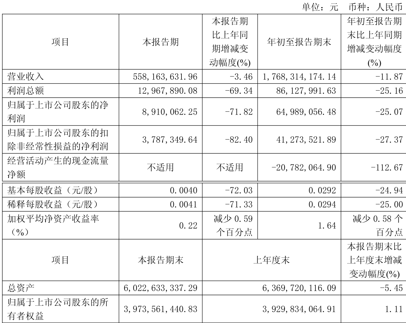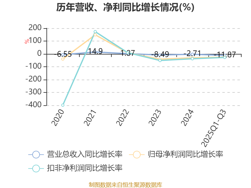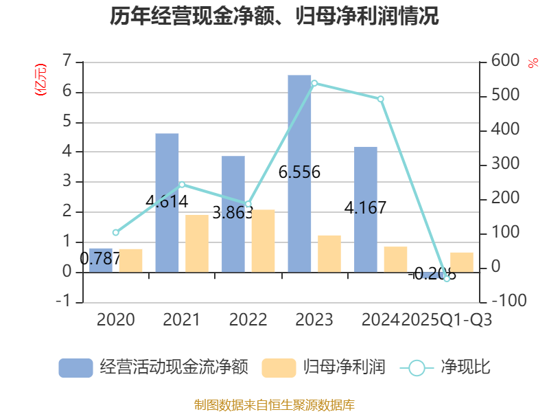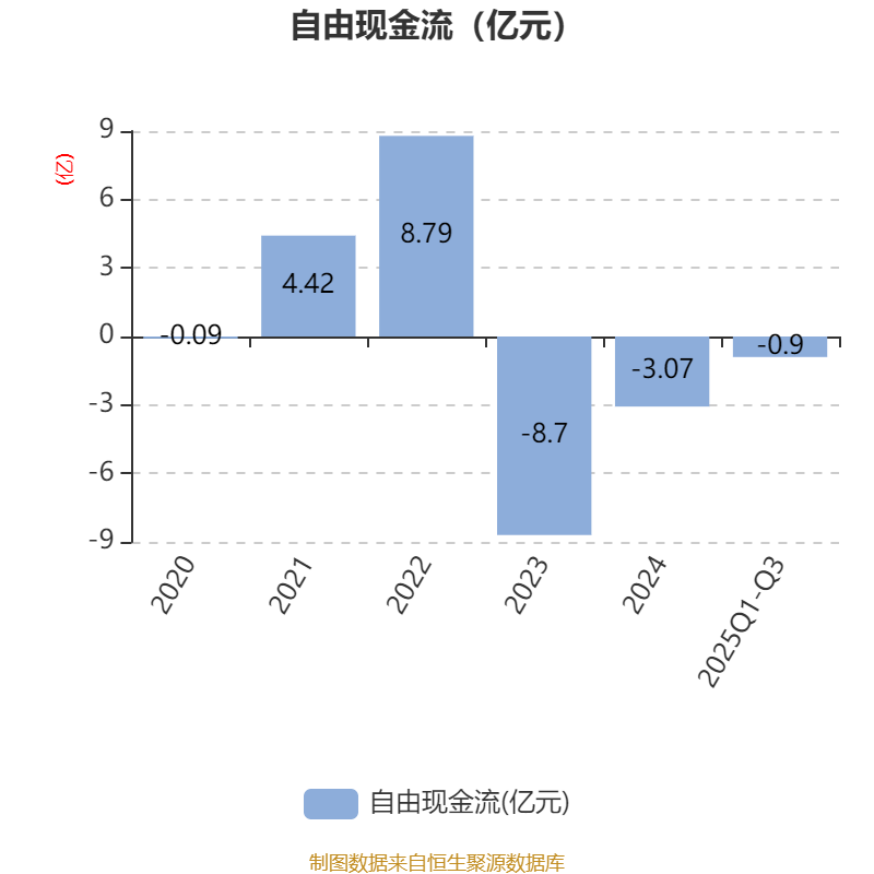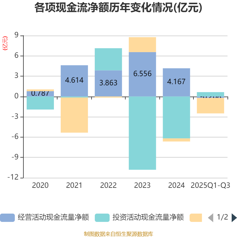2025年前三季度,公司经营活动现金流净额为-2078.21万元,同比减少1.85亿元;筹资活动现金流净额-2.29亿元,同比增加2749.32万元;投资活动现金流净额6456.41万元,上年同期为-3.84亿元。
