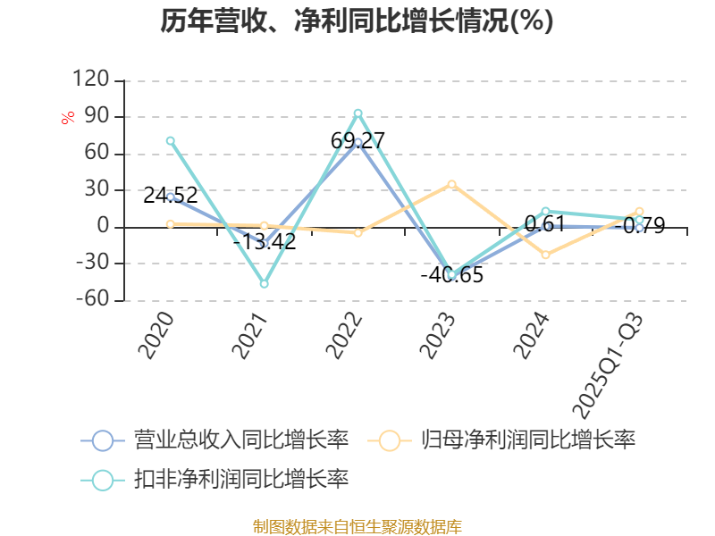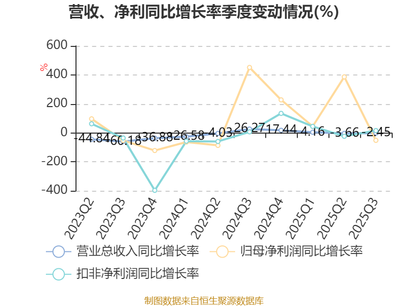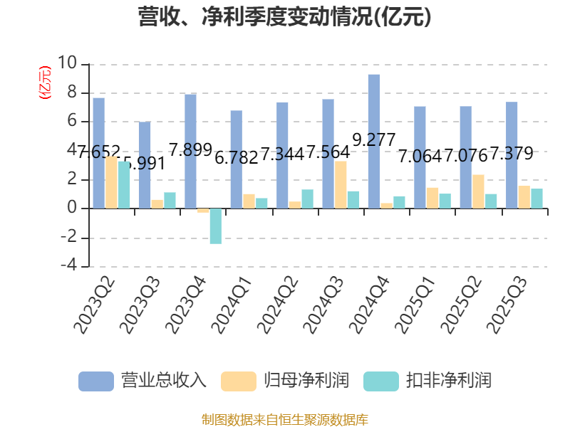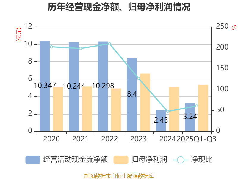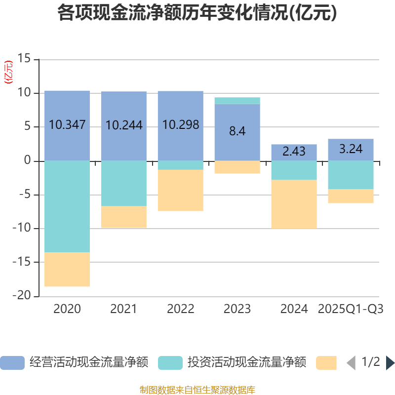 2025年前三季度,公司经营活动现金流净额为3.24亿元,同比增加5.06亿元;筹资活动现金流净额-2.06亿元,同比增加5.68亿元;投资活动现金流净额-4.19亿元,上年同期为5165.62万元。