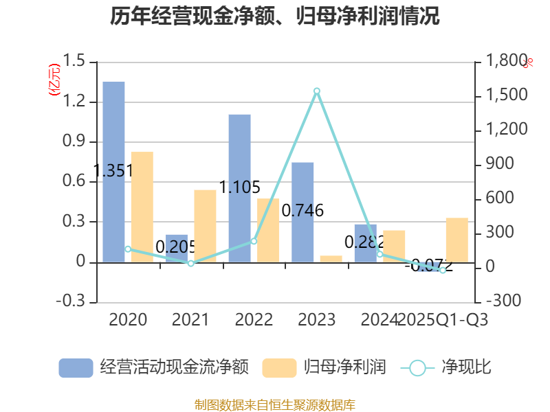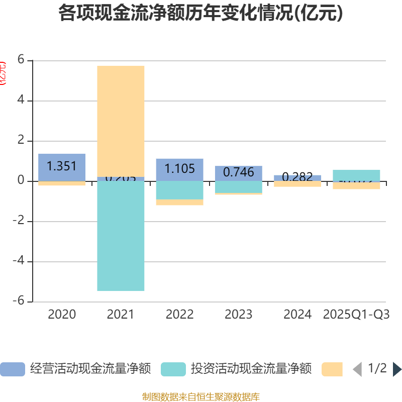 2025年前三季度,公司经营活动现金流净额为-716.13万元,同比减少3867.75万元;筹资活动现金流净额-3382.46万元,同比减少3490.61万元;投资活动现金流净额5485.92万元,上年同期为-1.05亿元。