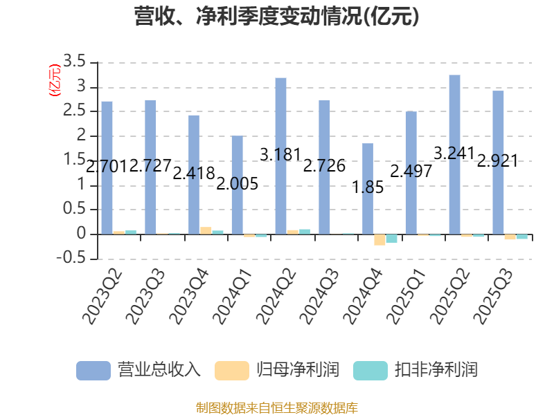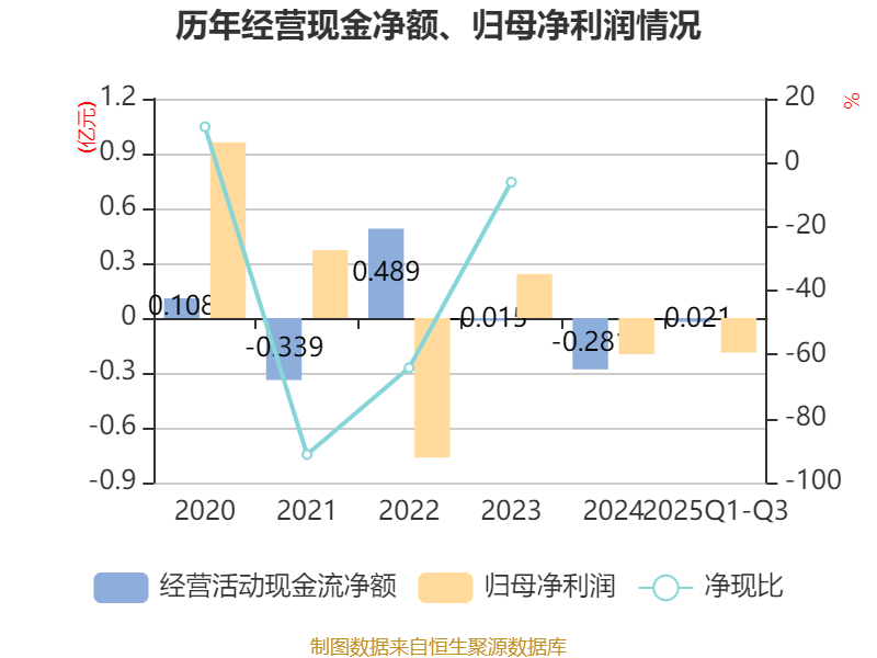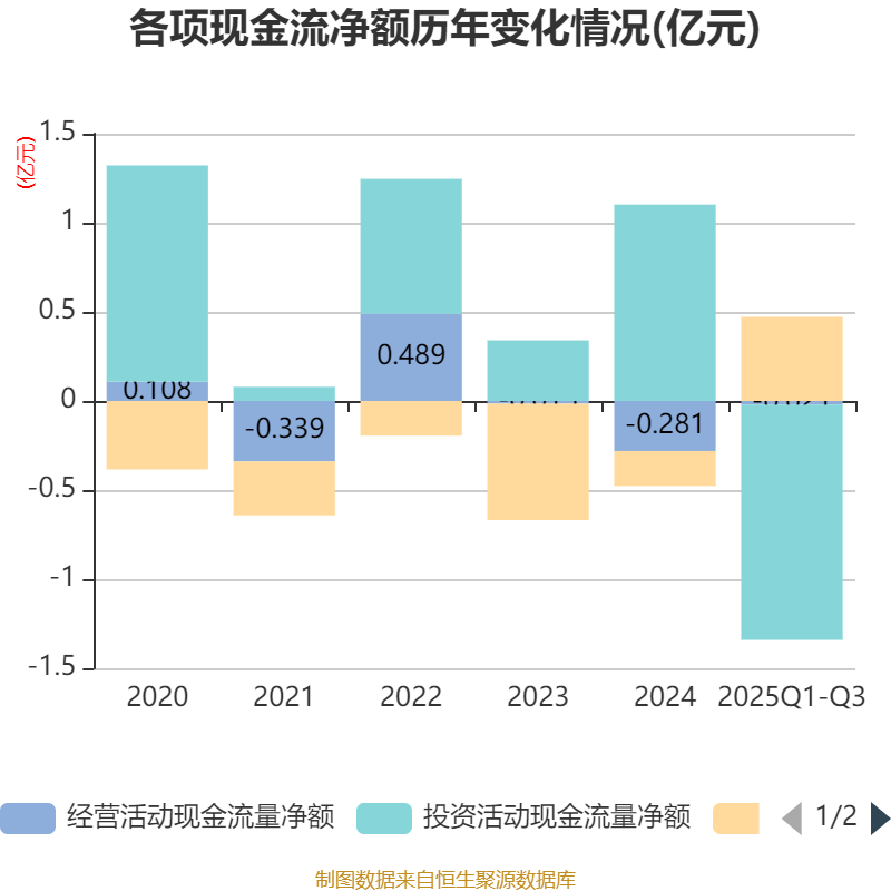 2025年前三季度,公司经营活动现金流净额为-206.33万元,同比增加933.98万元;筹资活动现金流净额4722.46万元,同比增加4691.92万元;投资活动现金流净额-1.32亿元,上年同期为2066.27万元。